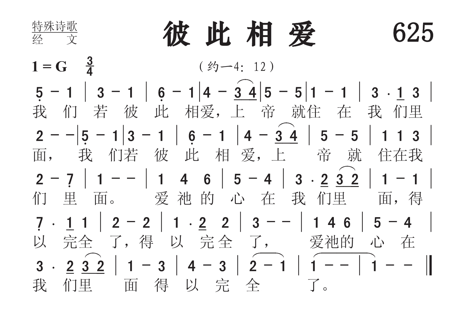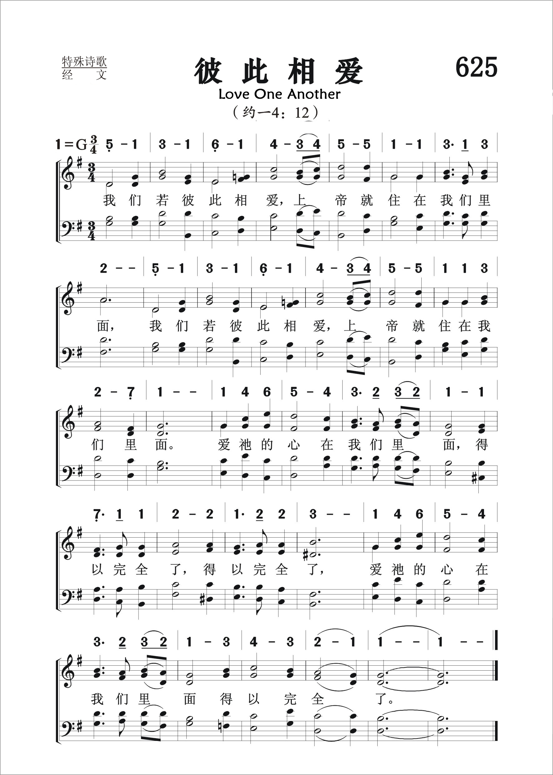 第625首 彼此相爱Love One Another(约一4:12) 我们若彼此相爱,上帝就住在我们里面, 我们若彼此相爱,上帝就住在我们里面。 爱祂的心在我们里面,得以完全了,得以完全了, 爱祂的心在我们里面得以完全了。