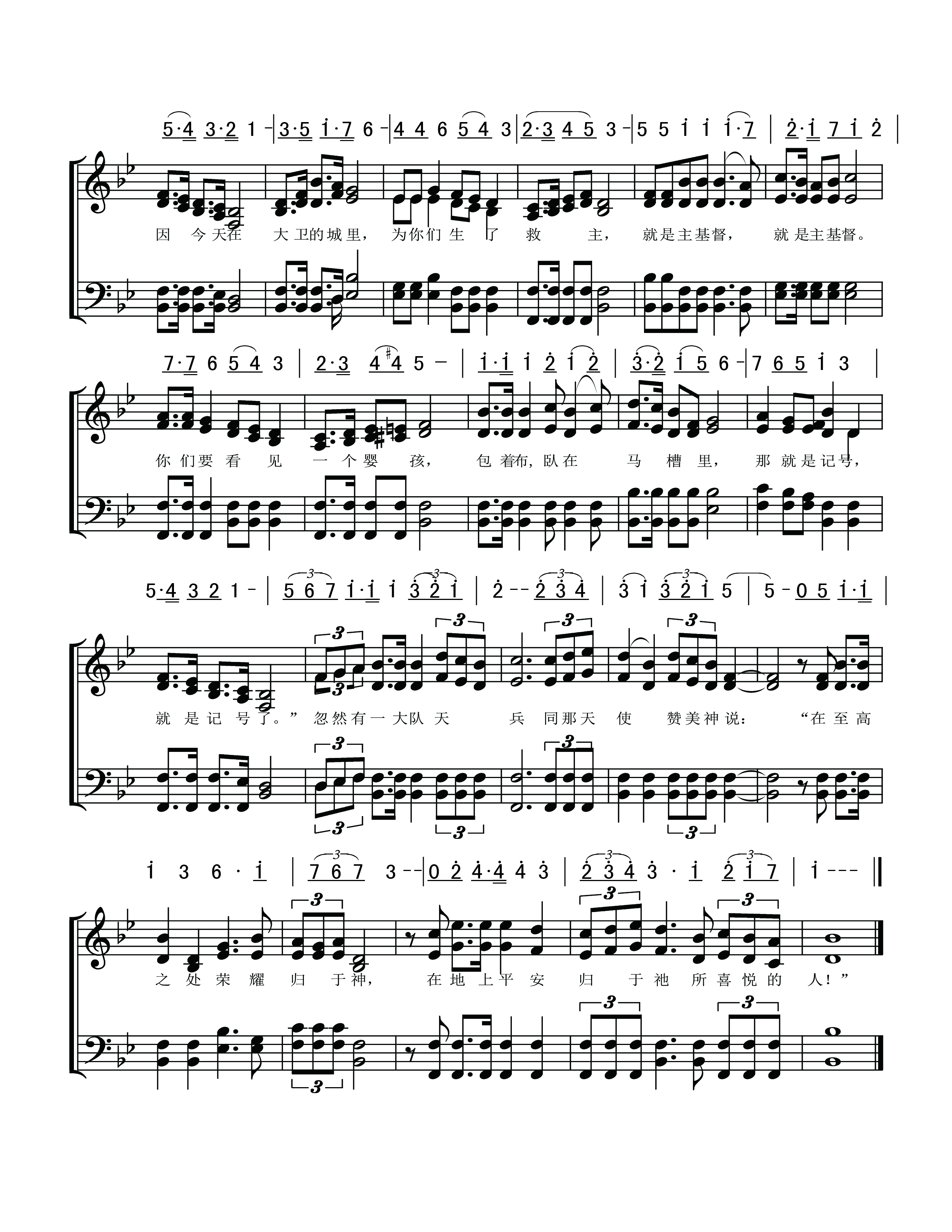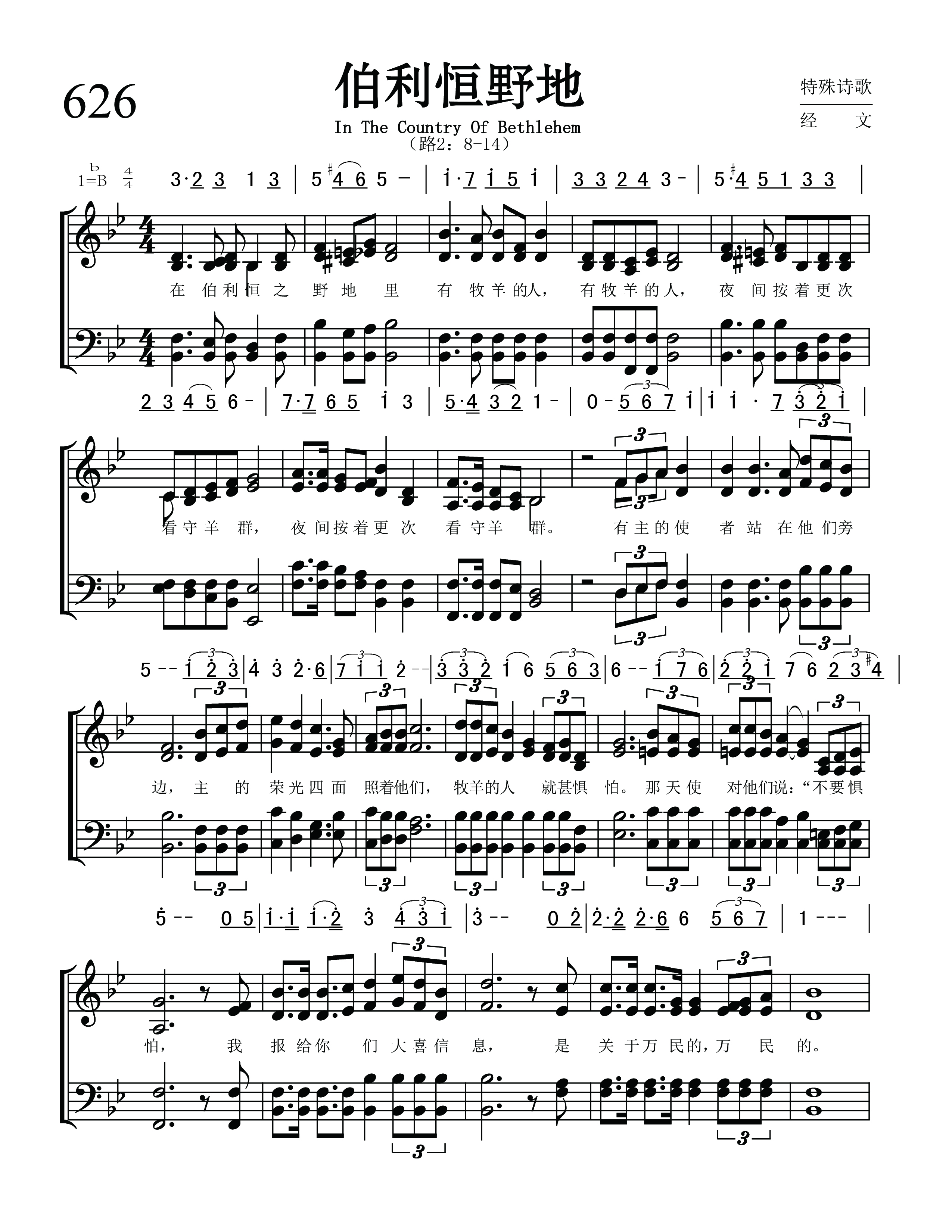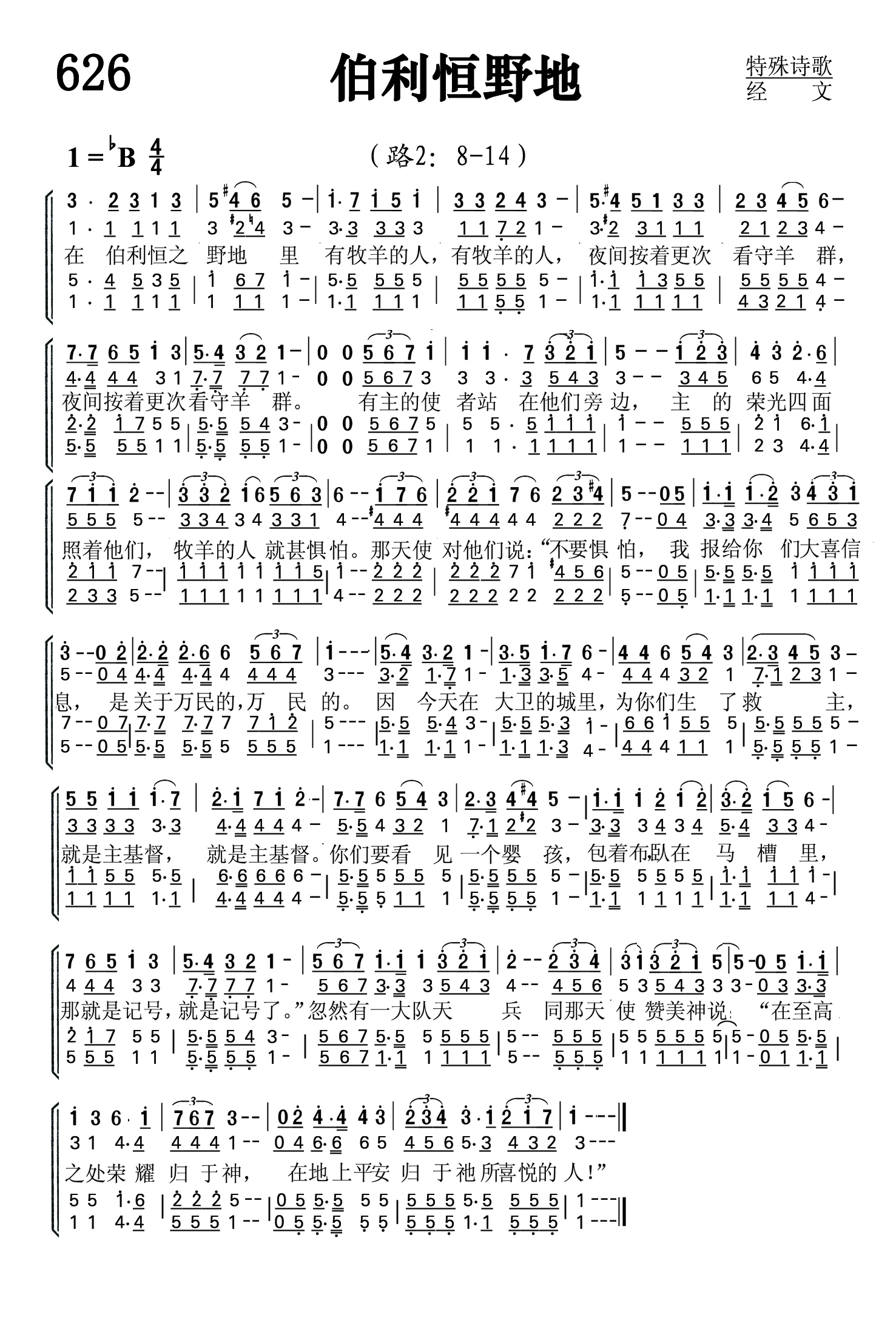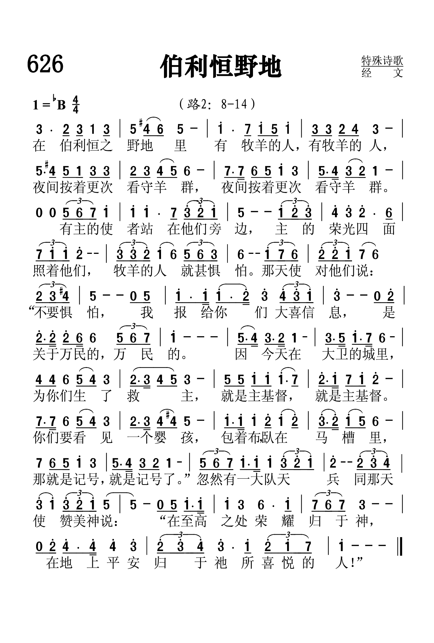 第626首伯利恒野地In the Country of Bethlehem (《颂赞圣诗》540首) (据路2:8-14) 在伯利恒之野地里有牧羊的人,有牧羊的人, 夜间按着更次看守羊群,夜间按着更次看守羊群。 有主的使者站在他们身边, 主的荣光四面照着他们, 牧羊的人就甚惧怕。那天使对他们说: “不要惧怕,我报给你们大喜信息, 是关于万民的,万民的。 因今天在大卫的城里,为你们生了救主, 就是主基督,就是主基督。 x你们要看见一个婴孩, 包着布,臥在马槽里, 那就是记号,就是记号了。” 忽然有一大队天兵同那天使赞美神说: “ 在至高之处荣耀归于神,在地上平安归于祂所喜悦的人!”