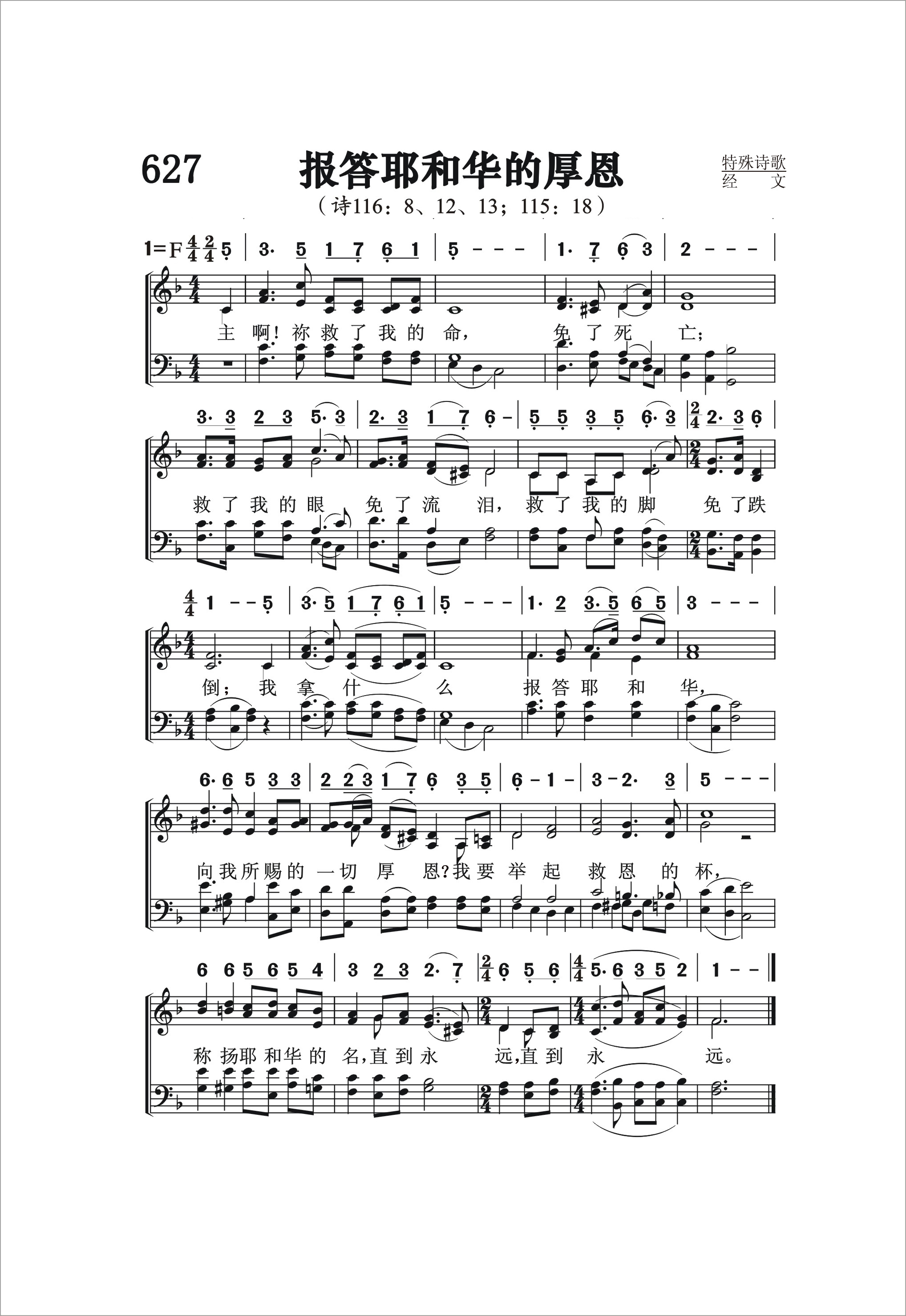 第627首报答耶和华的厚恩 For All His Benefits (据诗116:8、12、13;115:18) 主啊!祢救了我的命免了死亡; 救了我的眼免了流泪, 救了我的脚, 免了跌倒; 我拿什么报答耶和华向我所赐的一切厚恩 我要举起救恩的杯, 称扬耶和华的名直到永远, 直到永远。