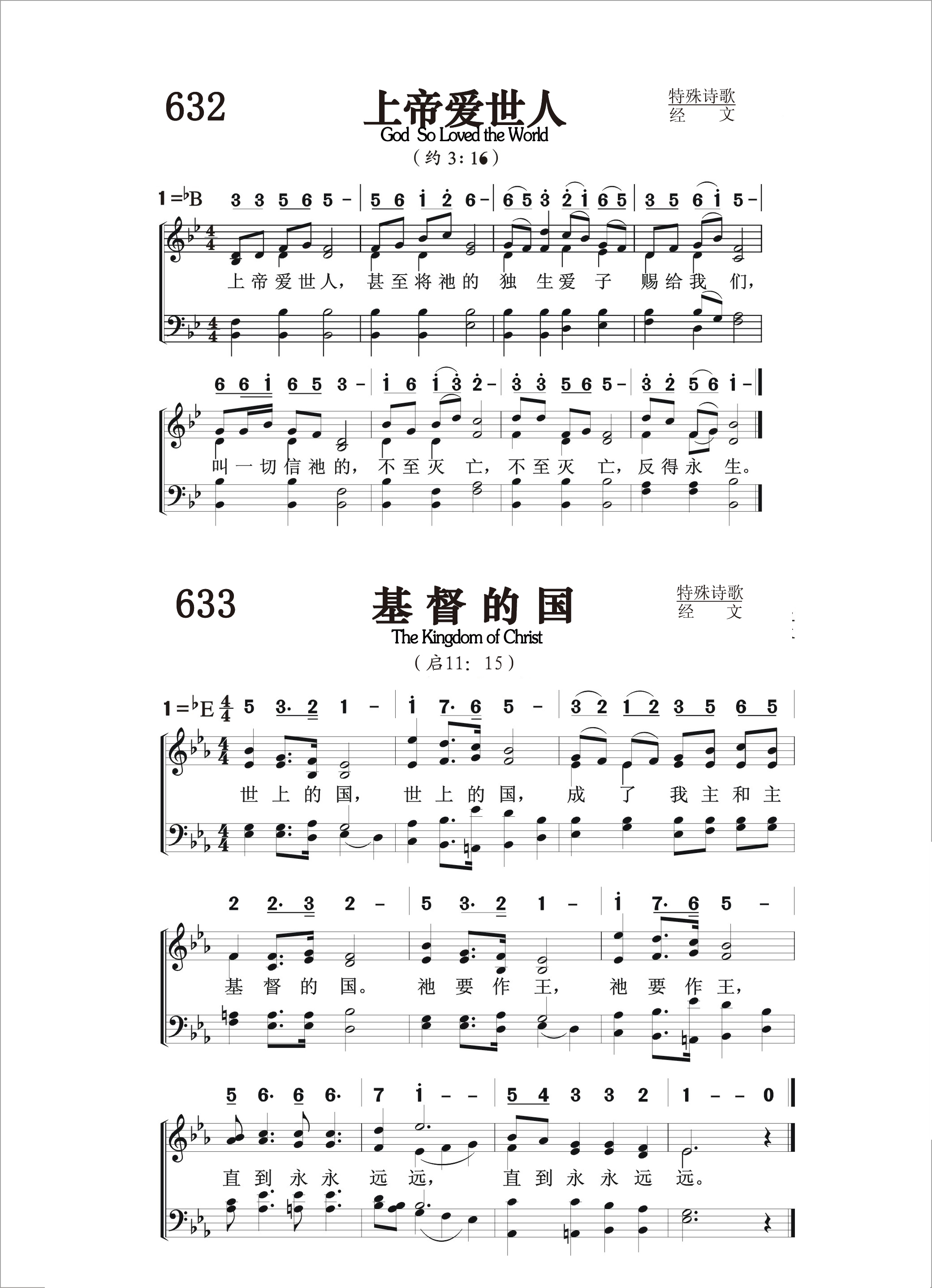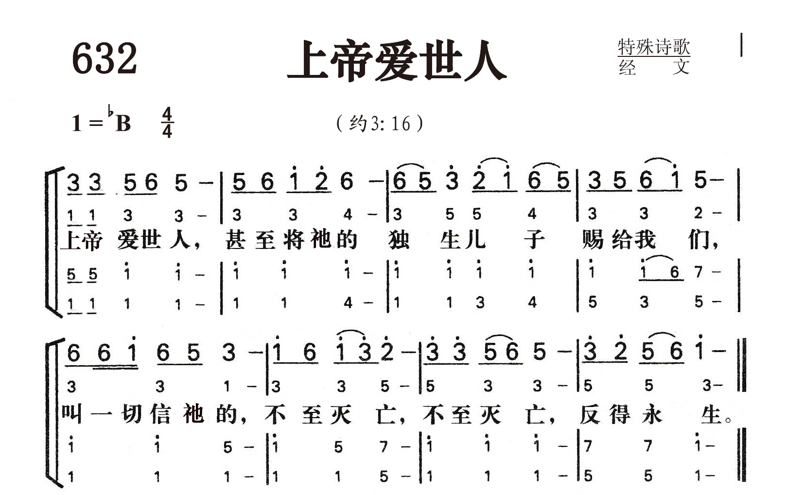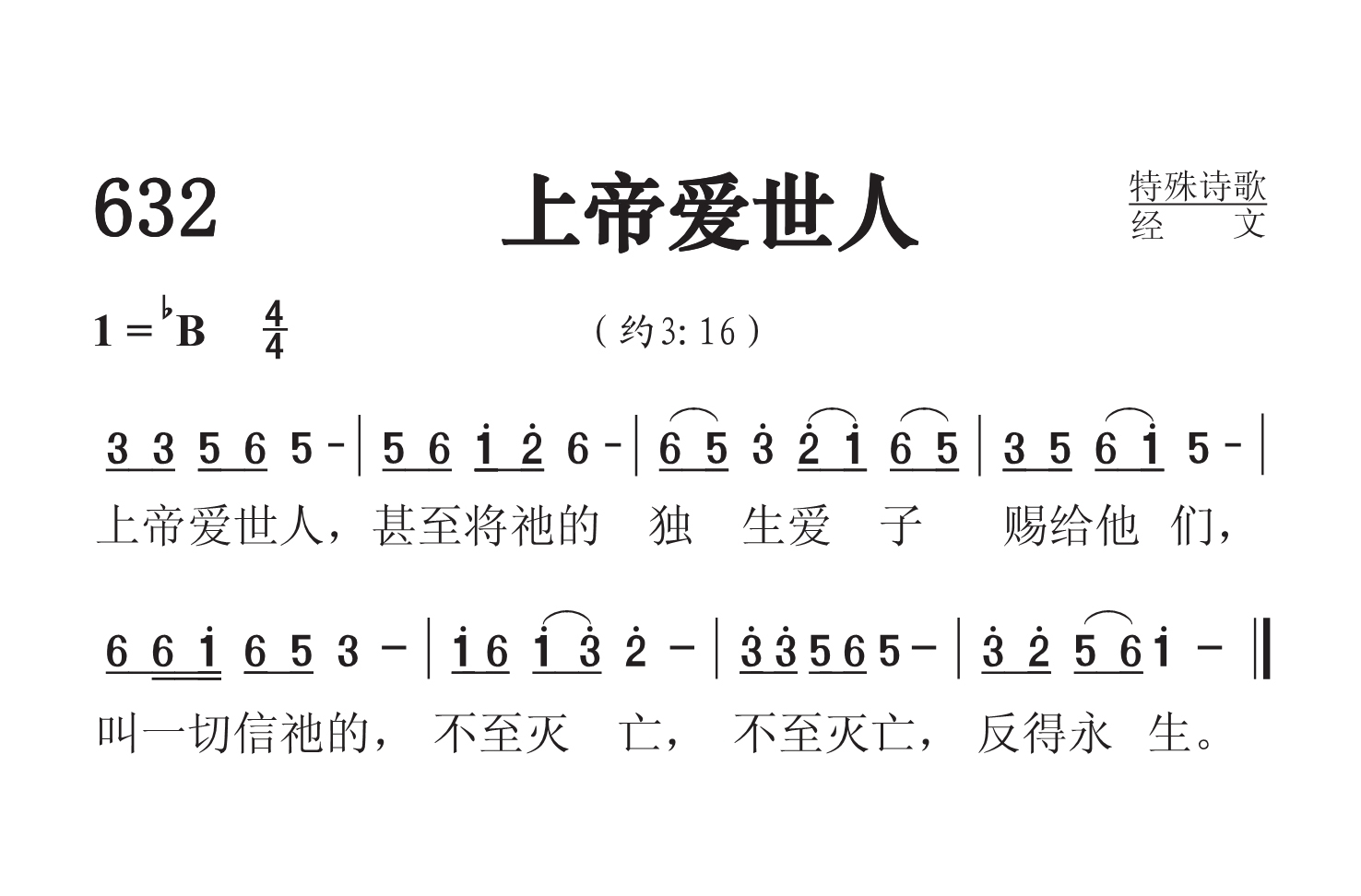 发布时间:2018-10-22 浏览: 次 编辑:福三哥 伴奏 原唱 第632首上帝爱世人 GodSo Loved the World (约3:16) 上帝爱世人,甚至将祂的独生子赐给他们, 叫一切信祂的,不至灭亡,反得永生