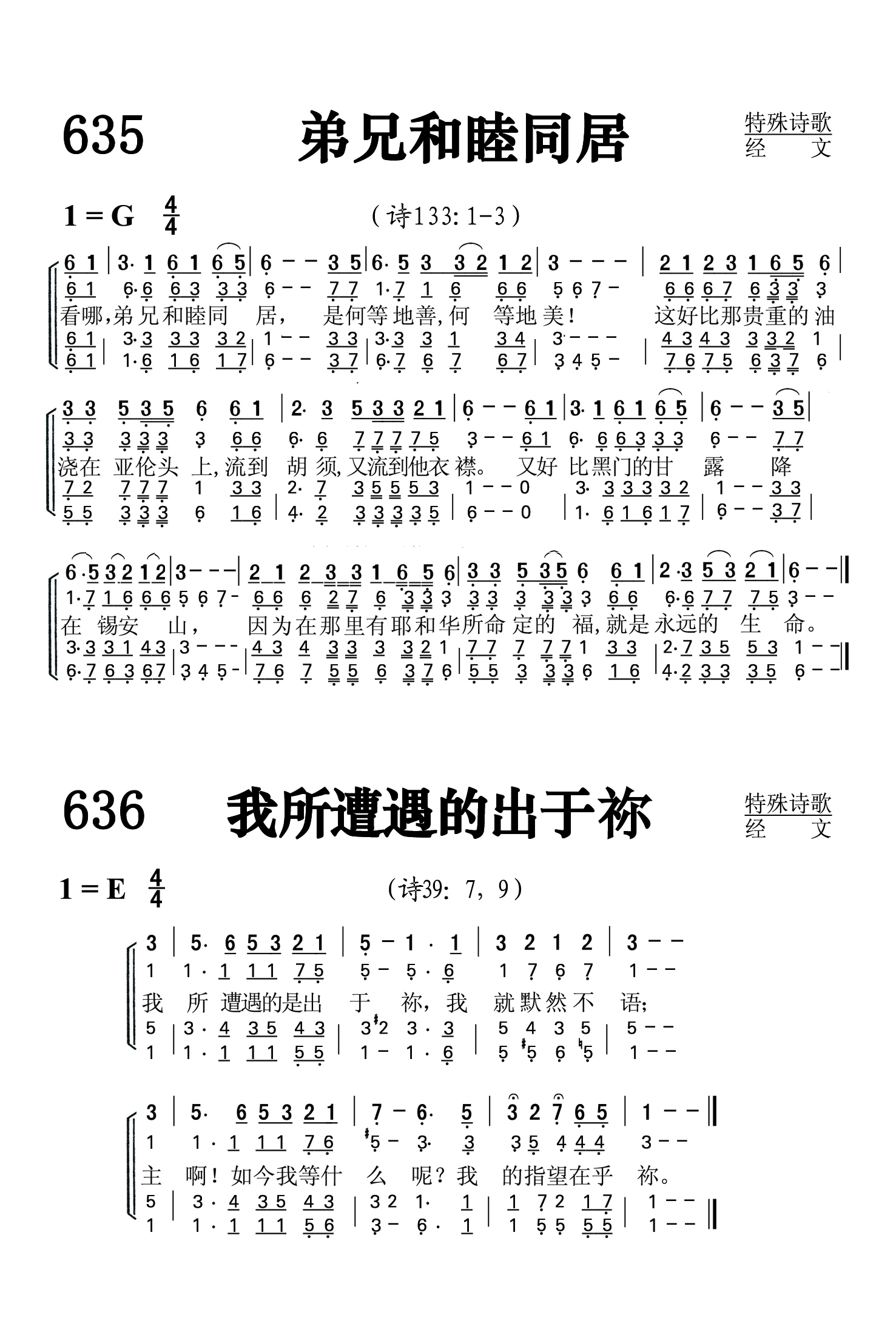 第635首 弟兄和睦同居Behold How Good and Pleasant 《诗篇》133篇,彼得森(Valerie Peterson)英译(1993年),谢佩琳(Elizabeth Tse)改编及配和声(1992年)《颂赞圣诗》554首 (诗133:1-3) 看哪,弟兄和睦同居,是何等地善,何等地美! 这好比那贵重的油 浇在亚伦头上, 流到胡须,又流到他衣襟。 又好比黑门的甘露降在锡安山, 因为在那里有耶和华所命 定的福, 就是永远的生命。
