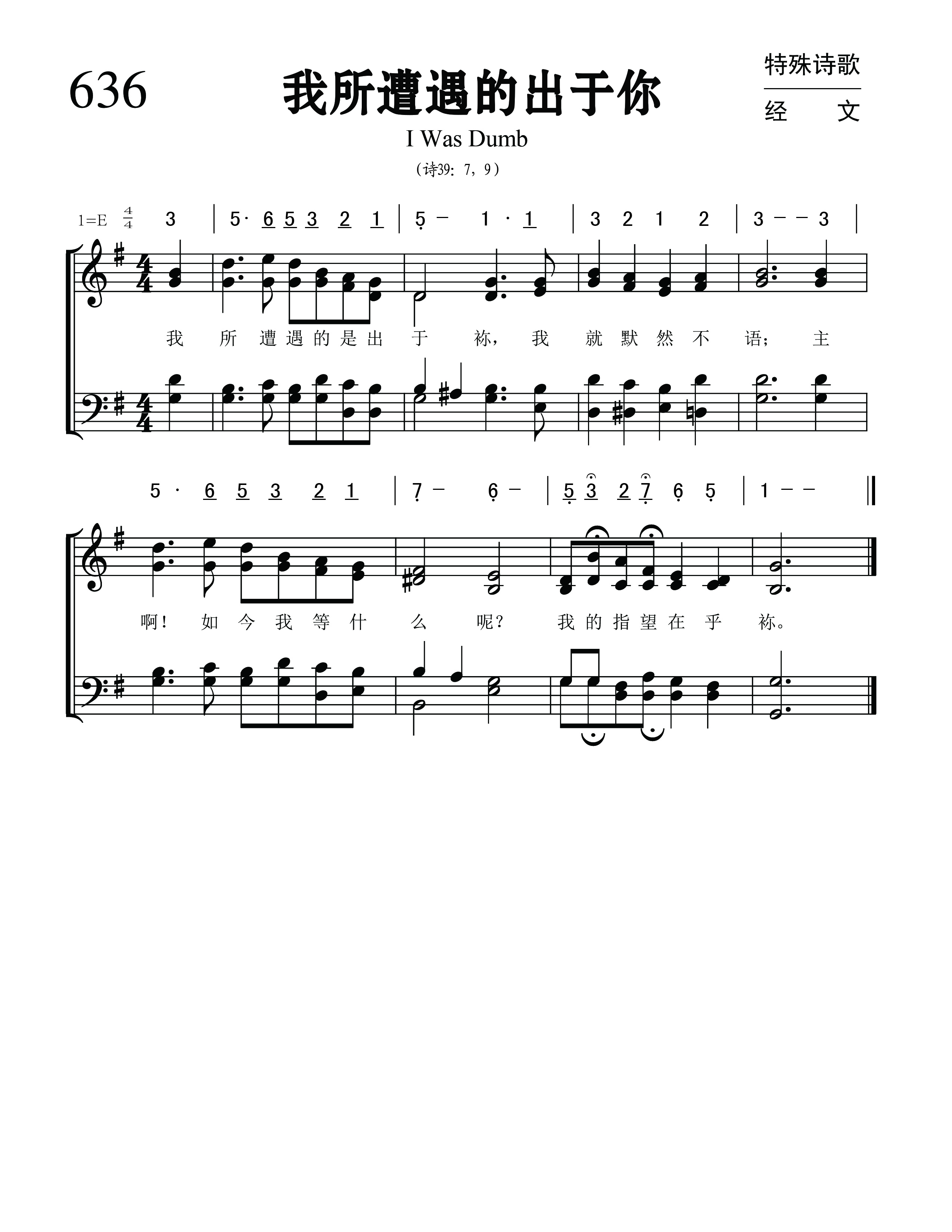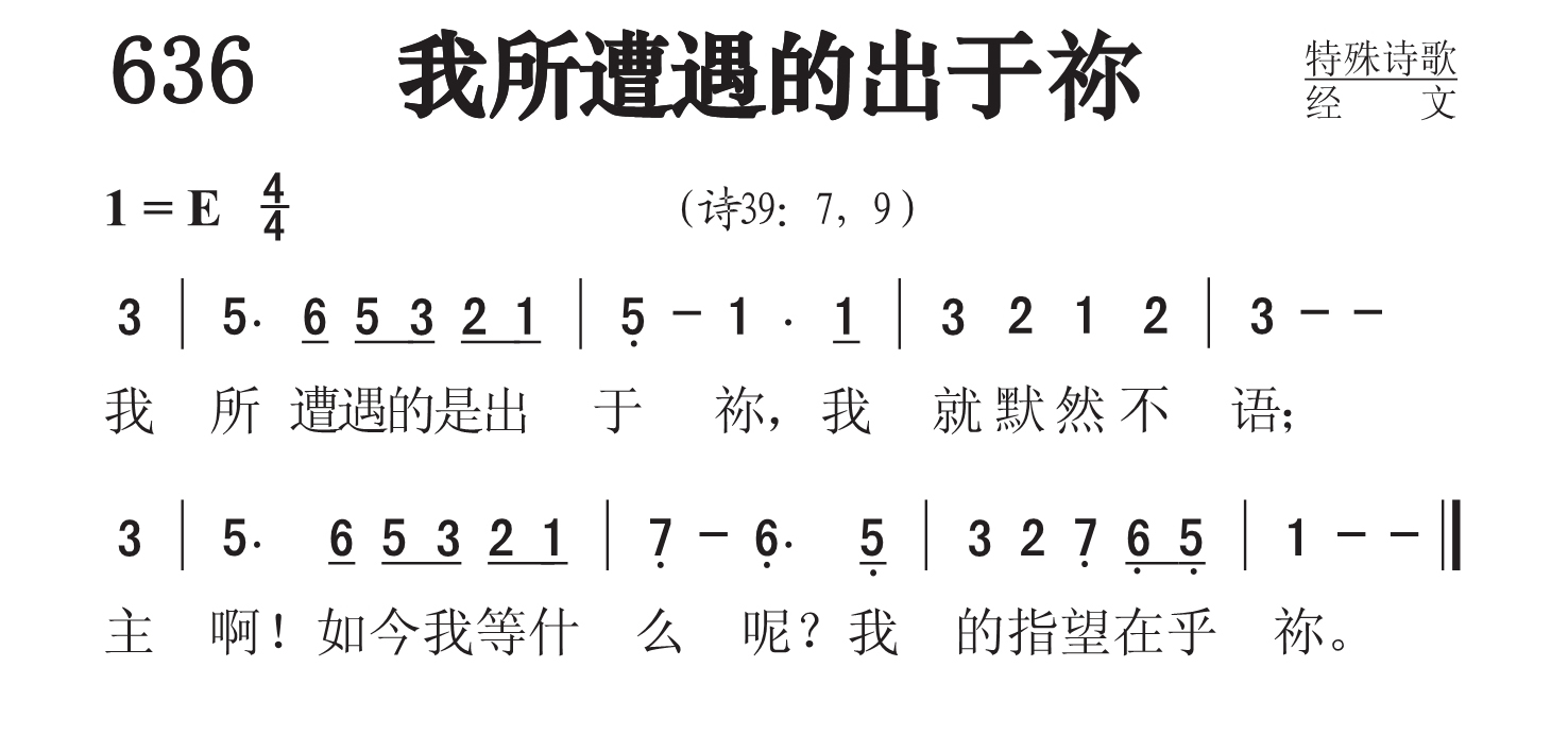 第636首我所遭遇的出于祢I Was Dumb 诗39:9、7;;苏佐扬(John Su ,1916-2007)作曲(1936.3.4写于山东滕县) (诗39:7,9) 我所遭遇的是出于袮, 我就默然不语; 主啊!如今我等什么呢?我的指望在乎袮。 苏佐扬牧师出生在香港,是第三代基督徒。1934年春他入山东华北神学院学习,1937年毕业后至1948年间,在华北、华南、西北共19个省内布道,以后移居香港,自1951年起开始向海外布道,到过数十个国家和地区,并创办天人神学院、天人出版社等,出版书籍多种。 苏佐扬14岁学会弹风琴后,有陆续学会吹喇叭,弹八弦琴、四弦琴、吉他、木琴等多种乐器。他少年时期就开始创作圣歌,在神学院时被采用为唱诗班的诗歌。1837年夏,他与华北神学院的陈恩福等三位同学,在校内共同创办《天人社》,工作之一就是写经文短歌,便于同学背诵经文,同年出版《天人短歌》简谱本81首,在抗战时期广为流传。《大山可以挪开》和667首《神啊求祢监察我》和680首《大山可以挪开》便是他的早期作品。他编著有《天人圣歌250首》和《天人短歌500首》其中有些诗歌被译成多种文字,转载使用。