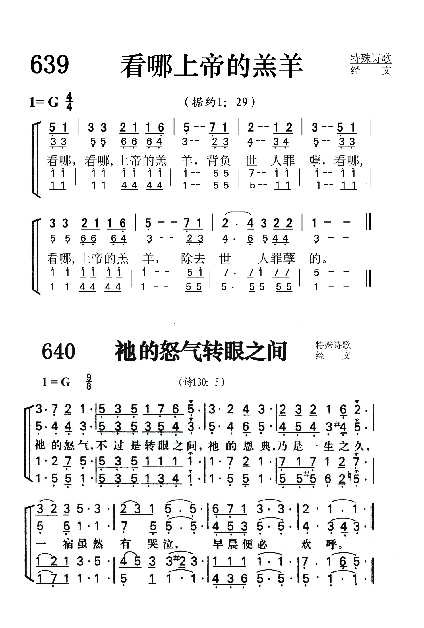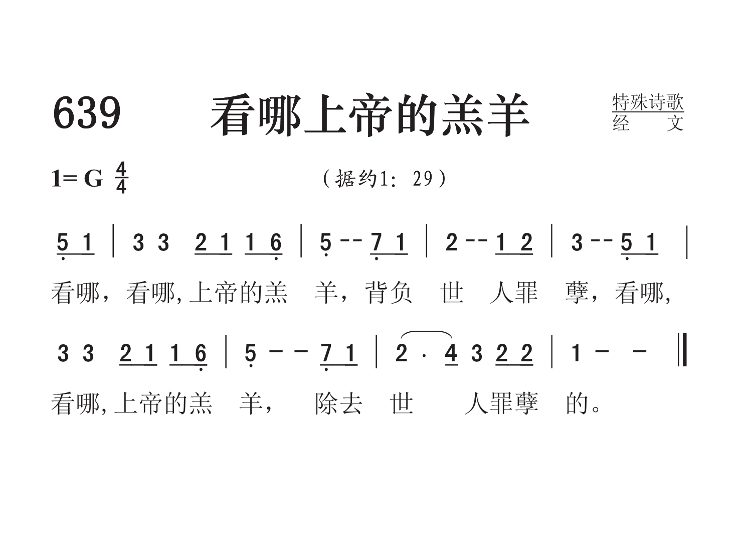 第639首看哪上帝的羔羊 Behold,the Lamb of God 经文(约1:29)诗歌,采用刘易斯.琼斯(Lewis Edgar Jones,1865,2,8-1936,9,1)所写《宝血大权能》(264首)副歌的旋律。 看哪,看哪,上帝的羔羊,背负世人罪孽, 看哪,看哪,上帝的羔羊,除去世人罪孽的。 刘易斯. 琼斯出生于美国伊利诺斯州耶茨城,从慕迪圣书学院毕业以后,积极参加衣阿华州,得克萨斯州,加利福尼亚州基督教青年会的工作,先后担任体育指导员,主任秘书等职。他在业余时间写了不少赞美诗。