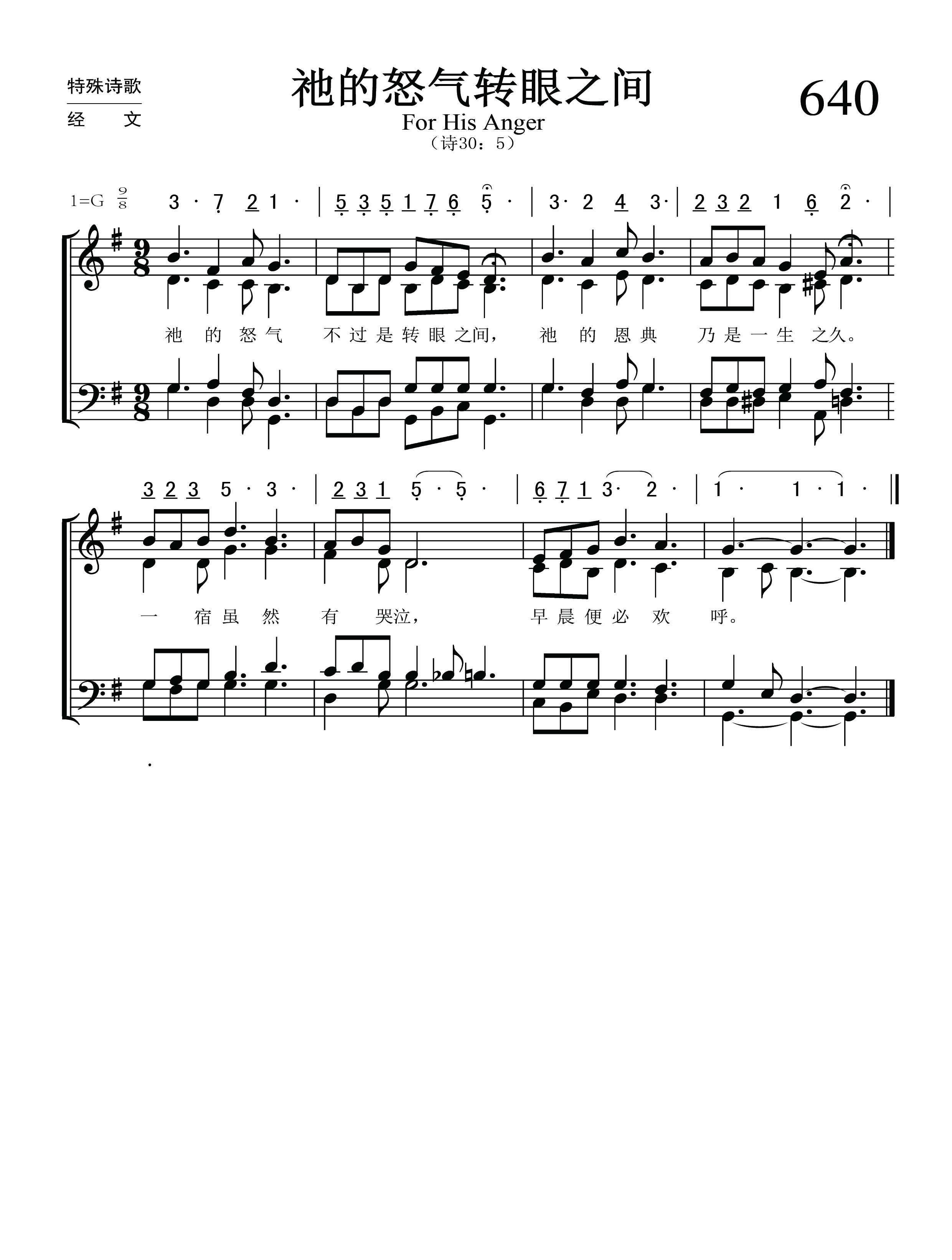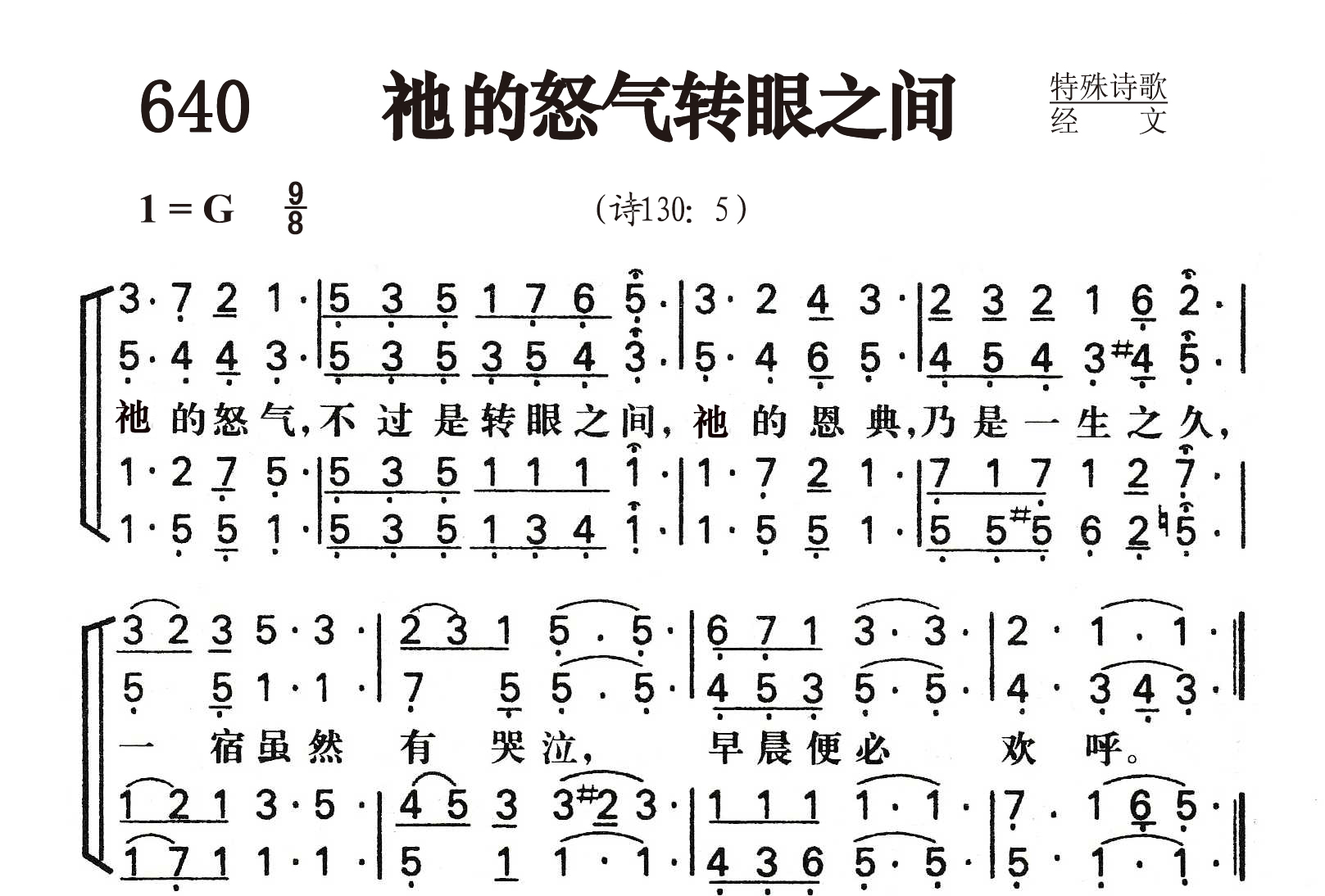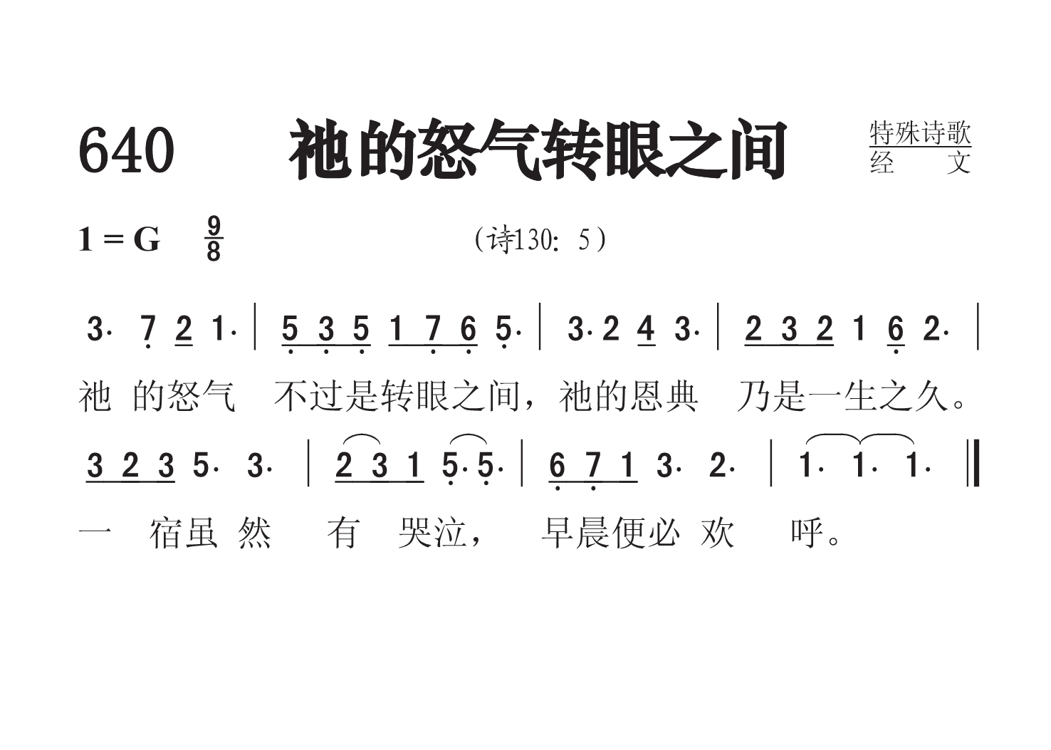 第640首祂的怒气转眼之间For His Anger 诗130:5;苏佐扬(John E.Su ,1916-2007)作曲(1936.3.3写于山东滕县) 祂的怒气不过是转眼之间,祂的恩典乃是一生之久。 一 宿虽然有哭泣, 早晨便必欢呼。 苏佐扬牧师出生在香港,是第三代基督徒。1934年春他入山东华北神学院学习,1937年毕业后至1948年间,在华北、华南、西北共19个省内布道,以后移居香港,自1951年起开始向海外布道,到过数十个国家和地区,并创办天人神学院、天人出版社等,出版书籍多种。 苏佐扬14岁学会弹风琴后,有陆续学会吹喇叭,弹八弦琴、四弦琴、吉他、木琴等多种乐器。他少年时期就开始创作圣歌,在神学院时被采用为唱诗班的诗歌。1837年夏,他与华北神学院的陈恩福等三位同学,在校内共同创办《天人社》,工作之一就是写经文短歌,便于同学背诵经文,同年出版《天人短歌》简谱本81首,在抗战时期广为流传。《神啊求祢监察我》和680首《大山可以移开》便是他的早期作品。他编著有《天人圣歌250首》和《天人短歌500首》其中有些诗歌被译成多种文字,转载使用。