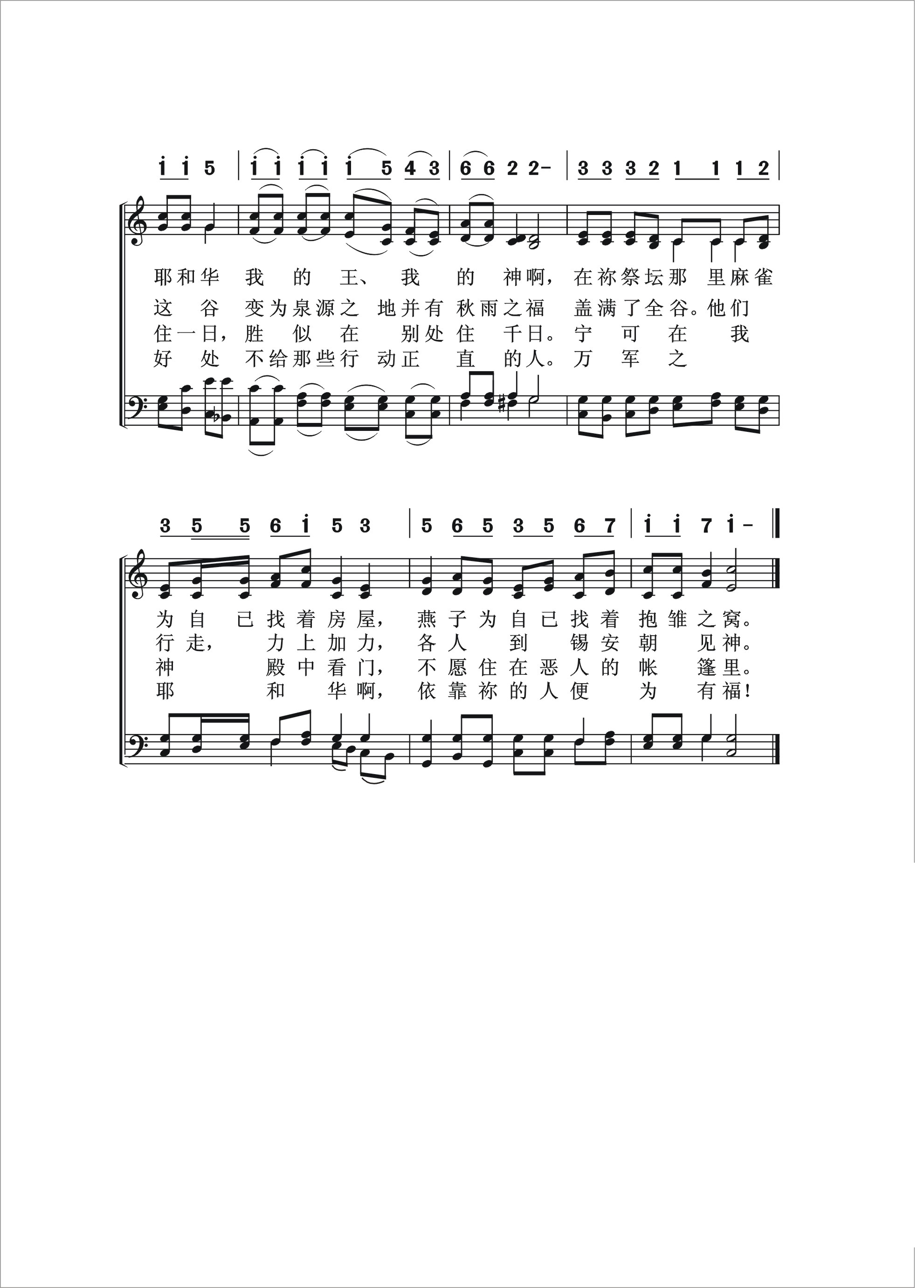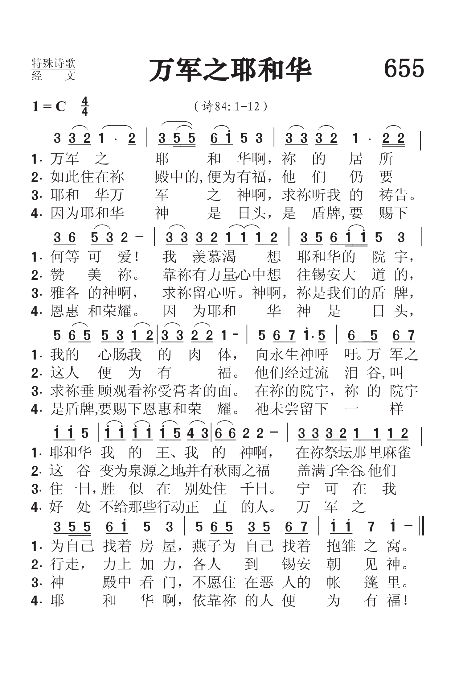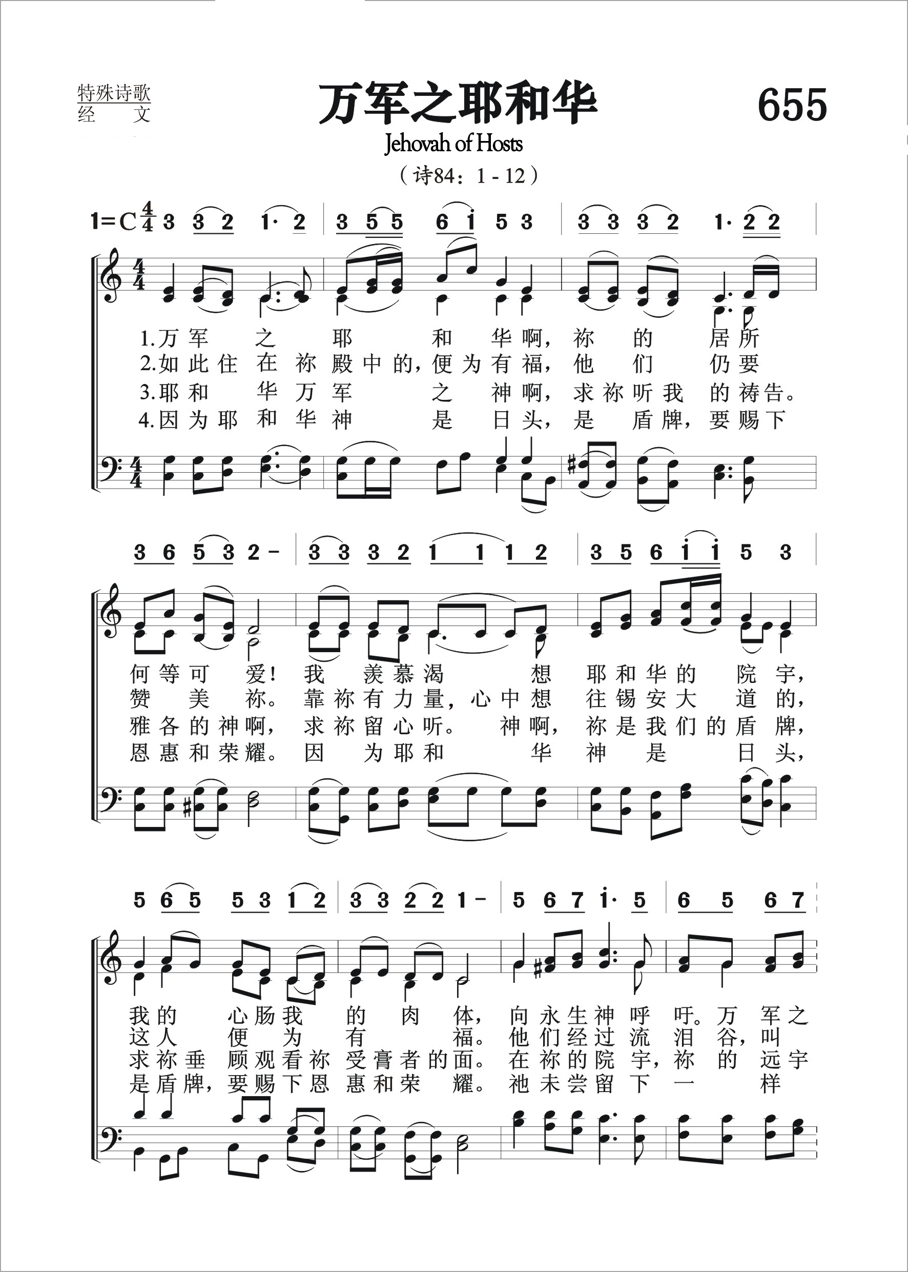 第656首 满园芬芳Fragrant Garden 唐守临(1906-1993)作词并改编英国曲调(1951年),周康耀配和声(1951年)(歌4:16) 北风啊,求速兴起!南风啊快吹来! 吹拂在我心园地,满园芬芳播开。 祂像林中苹果树,我喜坐祂荫下: 果实甘甜又成熟,心灵力量倍加。 愿我在祂的心上,如同印记铭刻; 祂爱比死更坚强,众水不能淹没。 我心所爱者,来啊,我属祢祢属我, 我们同往田间去,享受各样佳果。 主!我心所爱,到这里来, 与我永同在,尝我纯洁爱。 唐守临,又名唐醒,毕业于苏州东吴大学,曾在清心中学,复旦大学,东吴大学附属二中学执教。1929年献身传道。先在上海福音书房任编辑,参与修订基督徒聚会处的《诗歌》。作为倪柝声的同工,他先后在浙江、江苏、上海等地负责教会工作。抗战期间他曾去长沙、重庆等地传道。1950年至1958年担任上海教会长老。1956年以后带领一部分基督徒聚会处信徒参加三自,并长期担任中国基督教三自爱国运动委员会副主席。1982年,他担任中国基督徒圣诗委员会委员。1988年后任中国基督教协会第二、三届顾问。唐守临在诗歌创作方面很有才华。他自己又是出色的男低音。他写的许多诗歌在信徒中广为传唱。如本诗和376首《歌唱主爱》,698首《爱筵我尝》。1939年,唐守临编译出版了考门夫人的《荒漠甘泉》。1983年4月,唐守临等人曾为金陵协和神学院编写了抵制“呼喊派“的小册子。 本诗抒发了信徒与主相交的甜美感情,和他们对主的纯洁之爱。曲调原为英国民歌《兰铃》。 合声编配者周康耀是北京基督徒聚会处的创始人之一。他是北京清华艺术学院教授,擅长钢琴和声乐。