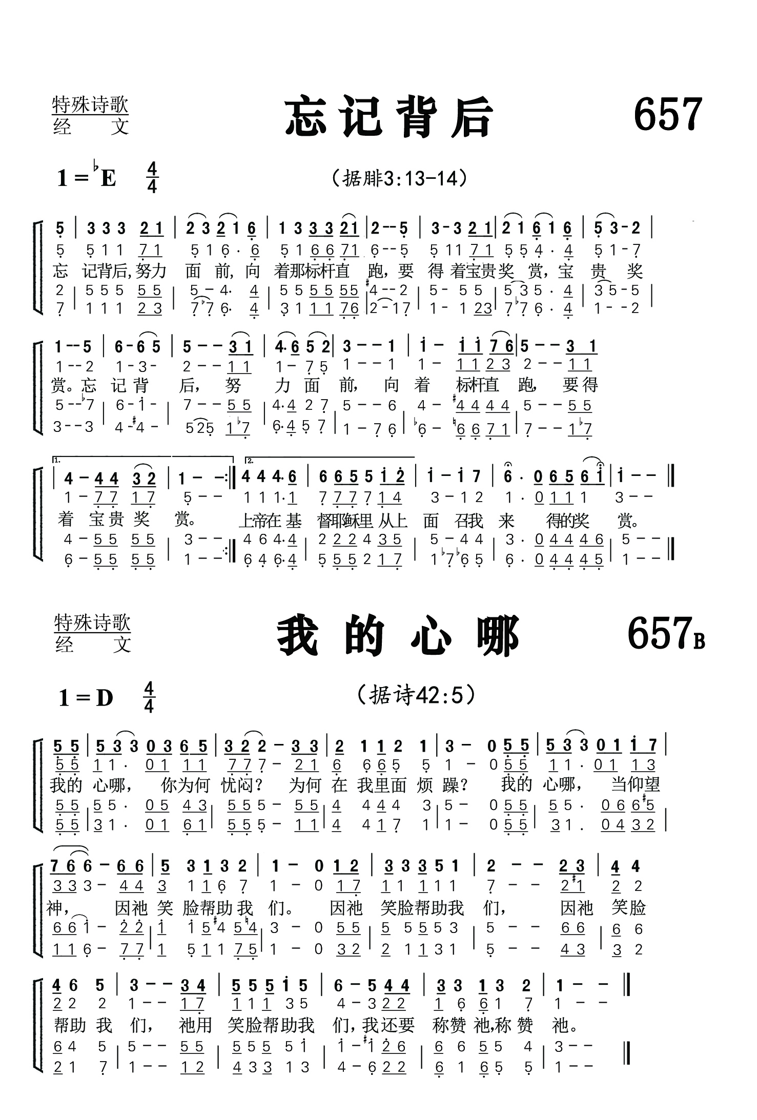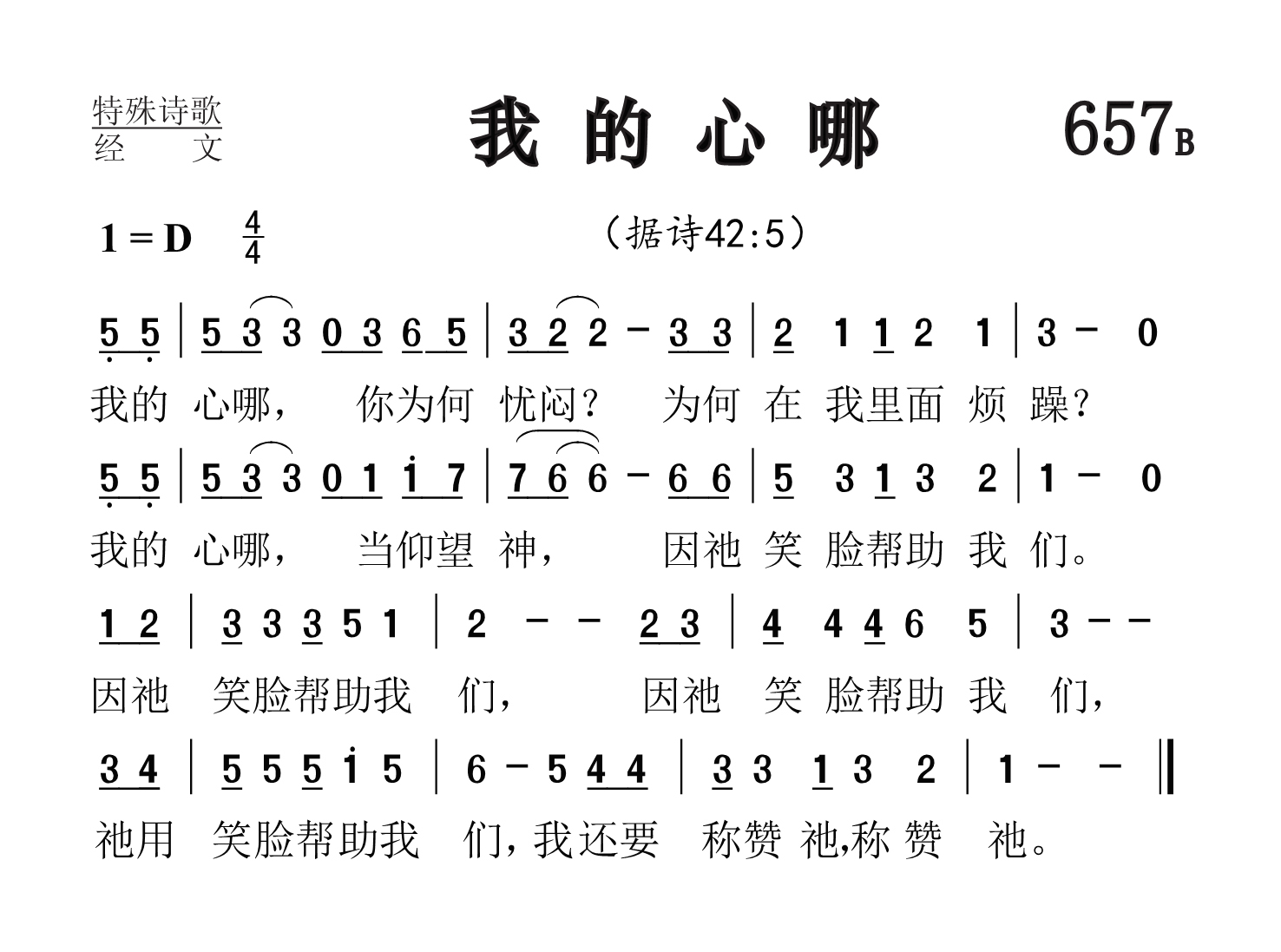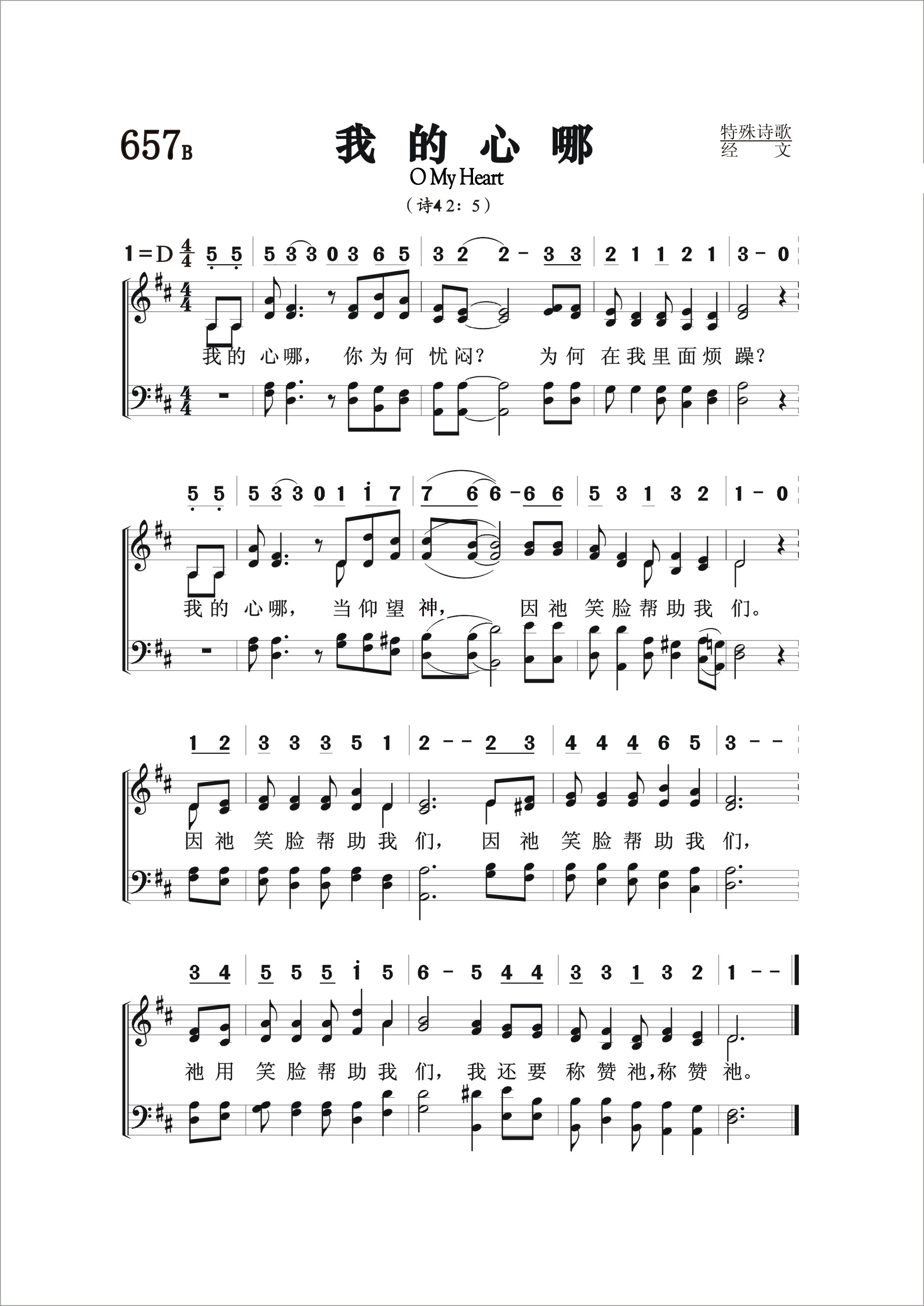 第657首B我的心哪O My Heart 叶薇心 作词祁少麟 作曲 (据诗42:5) 我的心哪,你为何忧闷? 为何在我里面烦躁? 我的心哪,当仰望神, 因祂笑脸帮助我们。 因祂笑脸帮助我们, 因祂笑脸帮助我们, 祂用笑脸帮助我们,我还要称赞 祂,称赞祂。 天韵合唱团是台湾知名的合唱团体,专业优美的和声却又不失亲切感的演出,贴近人心的旋律与歌词,使他们成为许多大小朋友都喜欢的团体。叶薇心,天韵的资深作词人,写过《野地的花》、《眼光》等多首非常好听的诗歌,在她的笔下,平淡的故事成为动人的歌词,也让她荣获金曲奖的肯定。为叶薇心开启创作之路的,正是她的第一份工作,也是到目前唯一待过的职场─救世传播协会,她更是在天韵合唱团待了27年;从初出社会的小女孩,到现在是公司里的资深员工,叶薇心回首这一路上酸甜苦辣,以及与救世传播协会创办人、天韵合唱团的推手彭蒙惠的师徒之情,更是充满许多欢笑与泪水。 2001年她选择挥别亮丽的舞台走向幕后,却也开始了她新的任务,如今成为一个协助别人的支援者,她也乐此不疲,继续用她的创作去影响他人,温暖世界。