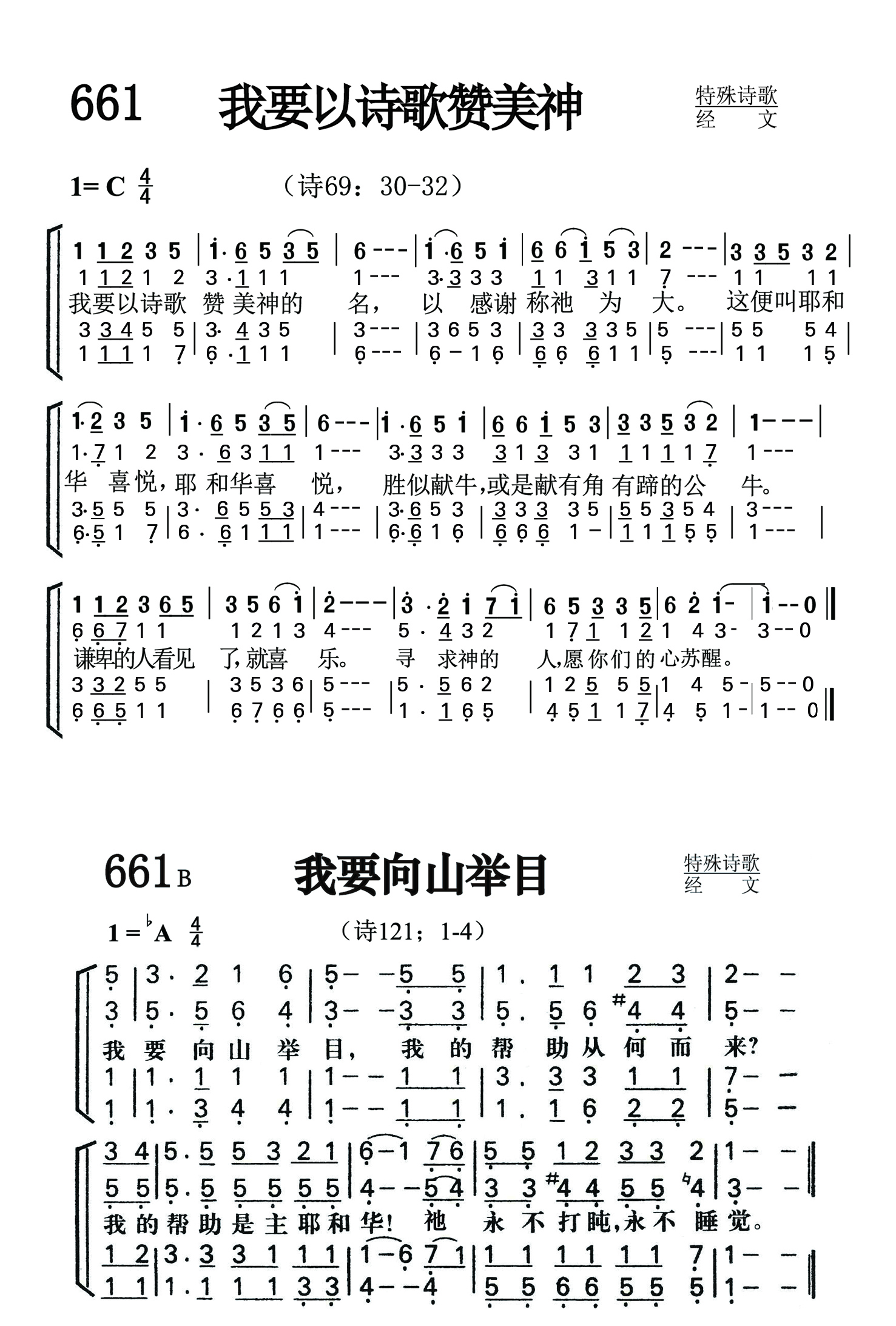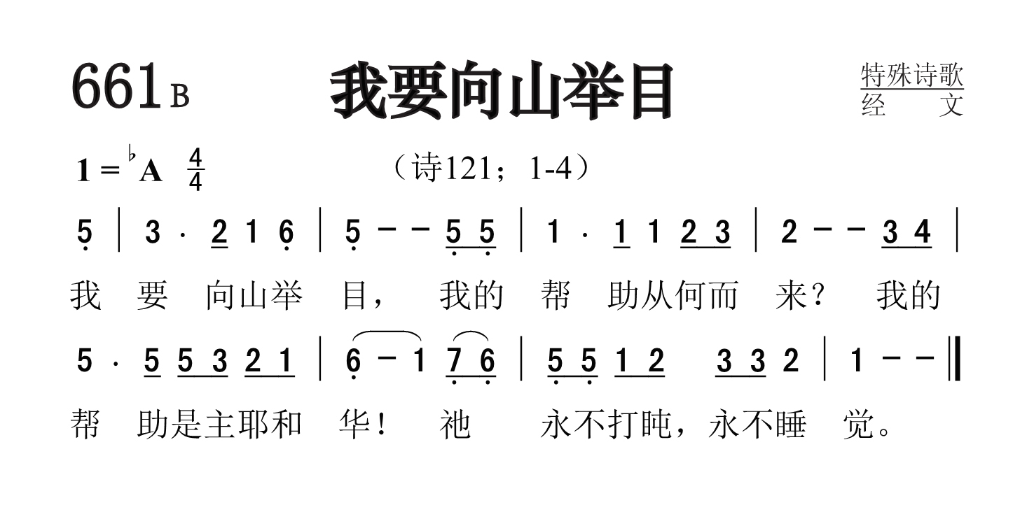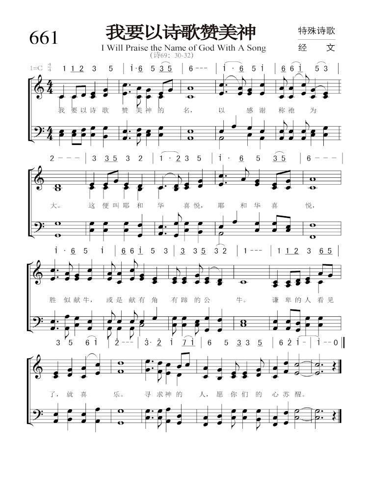 第661首你要以诗歌赞美神(诗69:30-32) I Will Praise the Name of God With a Song 我要以诗歌赞美神的名,以感谢称祂为大。 这便叫耶和华喜悦,胜似献牛,或是献有角有蹄的公牛。 谦卑的人看见了,就喜乐。寻求神的人,愿你们的心苏醒。 第661b首我要向山举目(诗121:1-4) I Will Lift Up Mine Eyes Unto the Mountains 我要向山举目。我的帮助从何而来。 我的帮助是主耶和华。 祂永不打盹,永不睡觉。