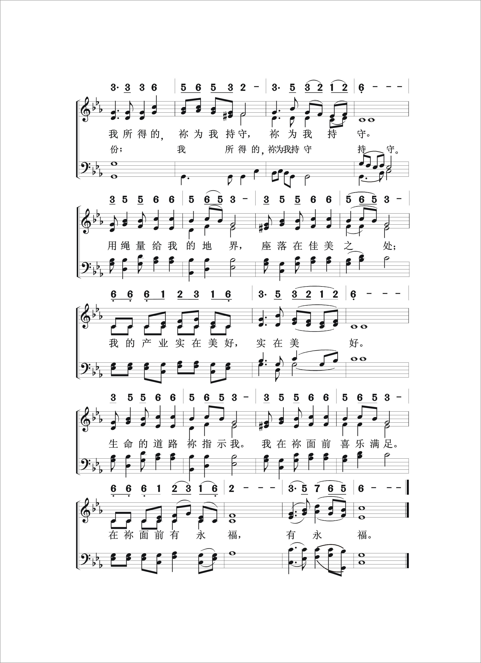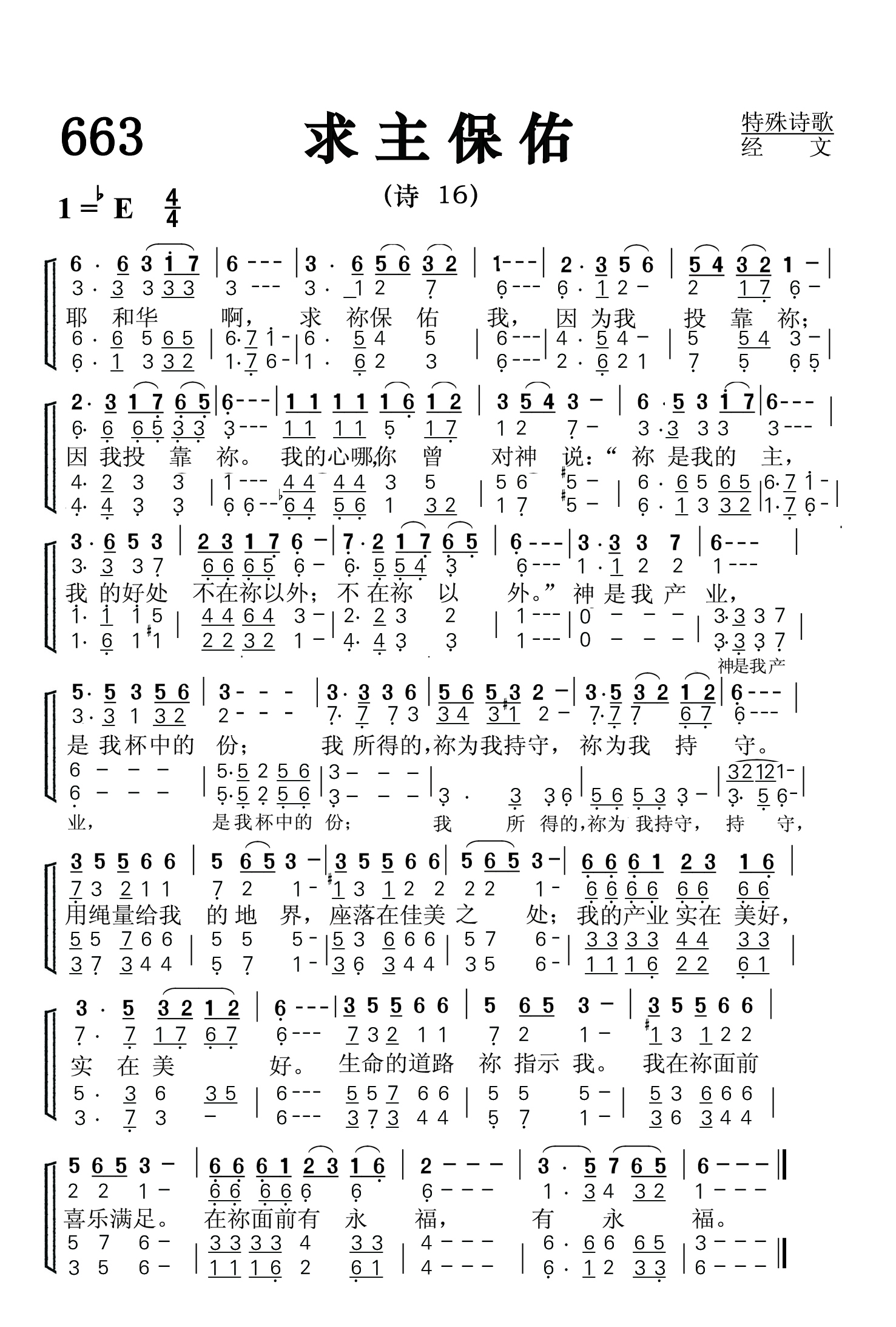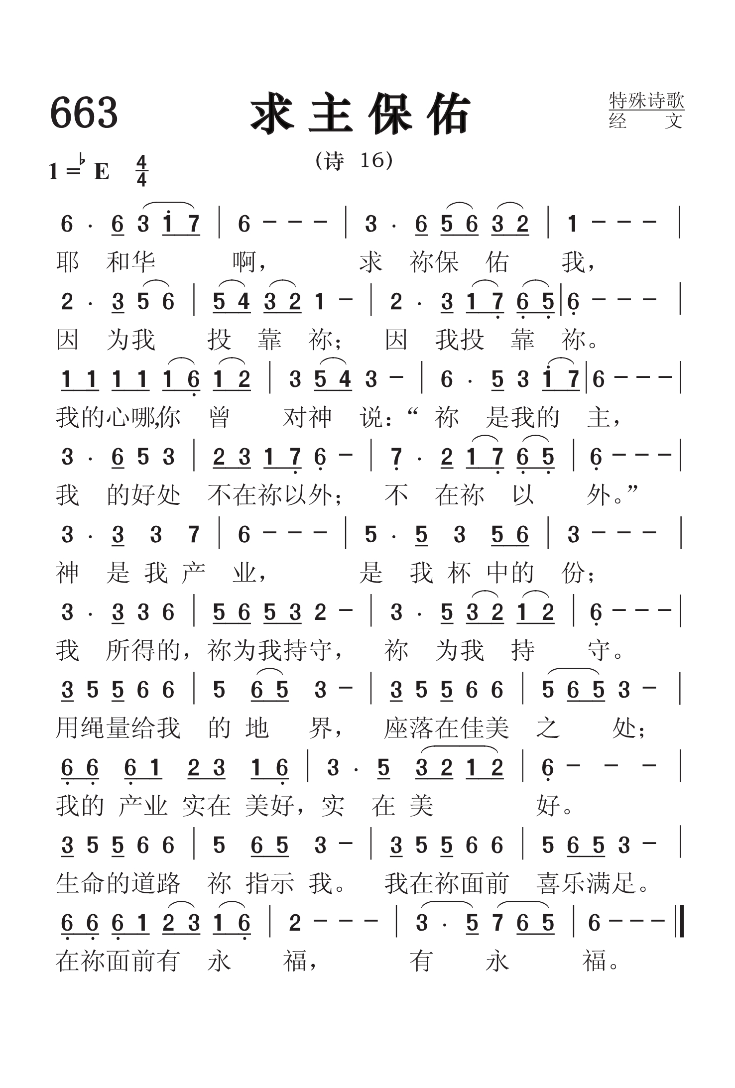 第663首求主保佑 Preserve Me ,O God (《诗篇》第16篇》) 《颂赞圣诗》563首 耶和华啊,求祢保佑我,因为我投靠祢;因为我投靠祢。我的心哪,你曾对神说:”祢是我的主。我的好处不在你以外,不在你以外。神是我的产业,是我杯中的分。我所得的祢为我持守,祢为我持守。用绳量给我的地界,坐落在佳美之处。我的产业实在美好,实在美好。生命的道路祢指示我。我在你面前喜乐满足。在你面前有永福。
