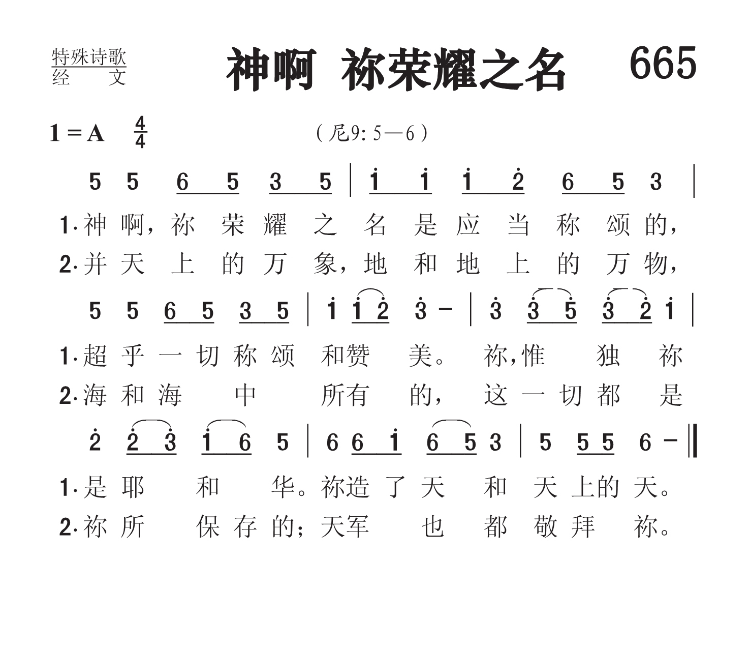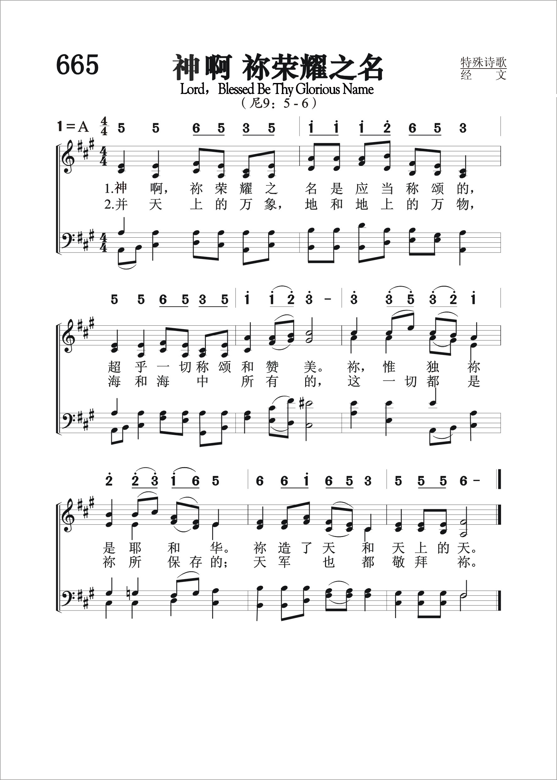 第665首神啊你荣耀之名 Lord,Blessed Be Thy Glorious Name (尼9:5,6) (《颂赞圣诗》601首) 神啊,你荣耀之名是应当称颂的。超乎一切称颂和赞美。 祢,惟独祢是耶和华。你造了天和天上的天,并天上的万象, 地和地上的万物,海和海中所有的。 这一切都是你所保存的。天军也都敬拜你。