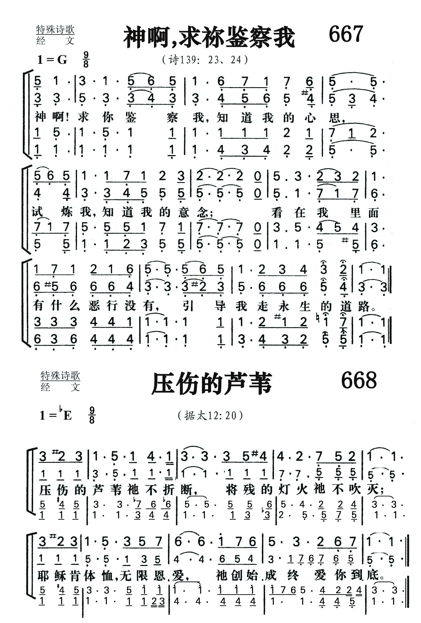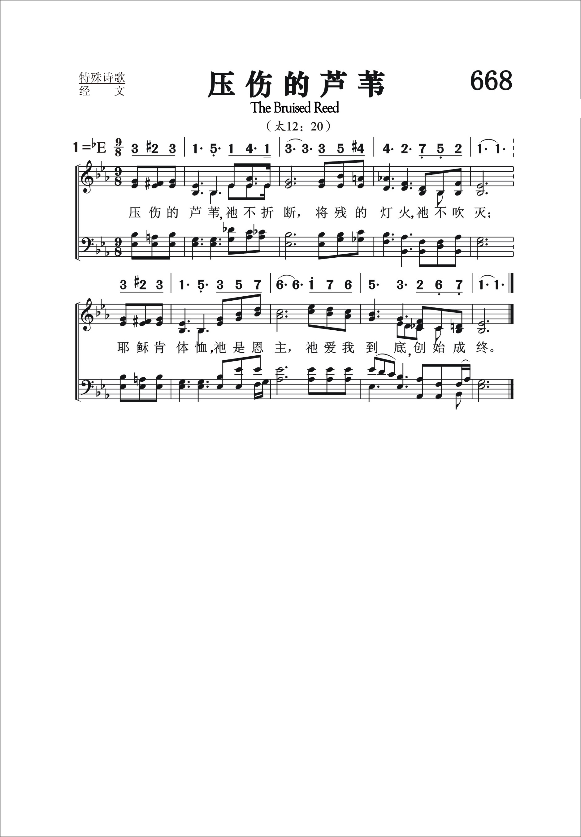 第668首压伤的芦苇The Bruised Reed 太12:20;来4:15;苏佐扬(John E.Su ,1916-2007)作曲(1935.10.4写于香港) 压伤的芦苇, 祂不折断, 将残的灯火, 祂不吹 灭; 耶稣肯体恤,祂是恩主,祂爱我到底,创始成终。 苏佐扬牧师出生在香港,是第三代基督徒。1934年春他入山东华北神学院学习,1937年毕业后至1948年间,在华北、华南、西北共19个省内布道,以后移居香港,自1951年起开始向海外布道,到过数十个国家和地区,并创办天人神学院、天人出版社等,出版书籍多种。 苏佐扬14岁学会弹风琴后,有陆续学会吹喇叭,弹八弦琴、四弦琴、吉他、木琴等多种乐器。他少年时期就开始创作圣歌,在神学院时被采用为唱诗班的诗歌。1837年夏,他与华北神学院的陈恩福等三位同学,在校内共同创办《天人社》,工作之一就是写经文短歌,便于同学背诵经文,同年出版《天人短歌》简谱本81首,在抗战时期广为流传。《神啊,求祢监察我》和680首《大山可以移开》便是他的早期作品。他编著有《天人圣歌250首》和《天人短歌500首》其中有些诗歌被译成多种文字,转载使用。