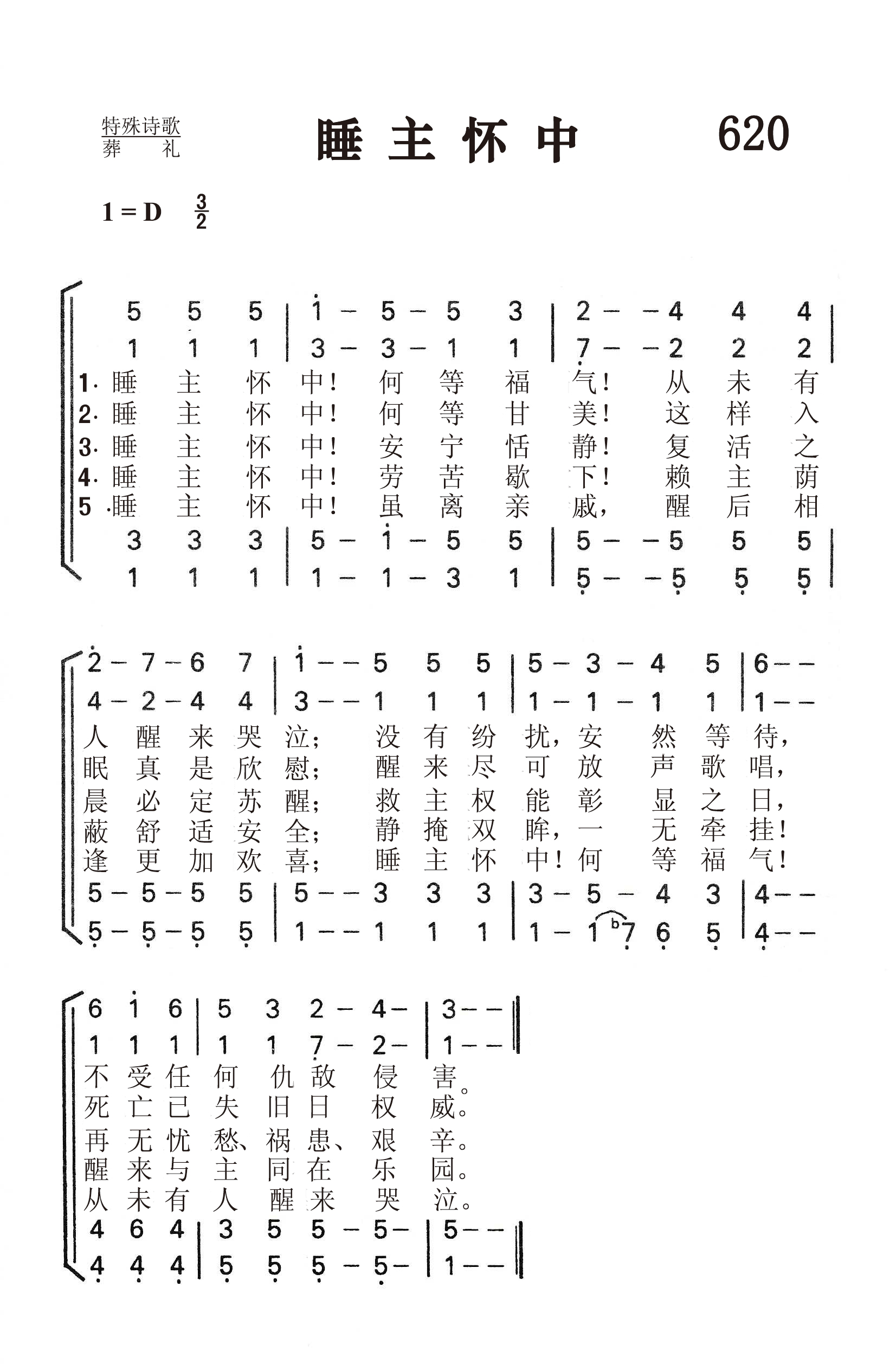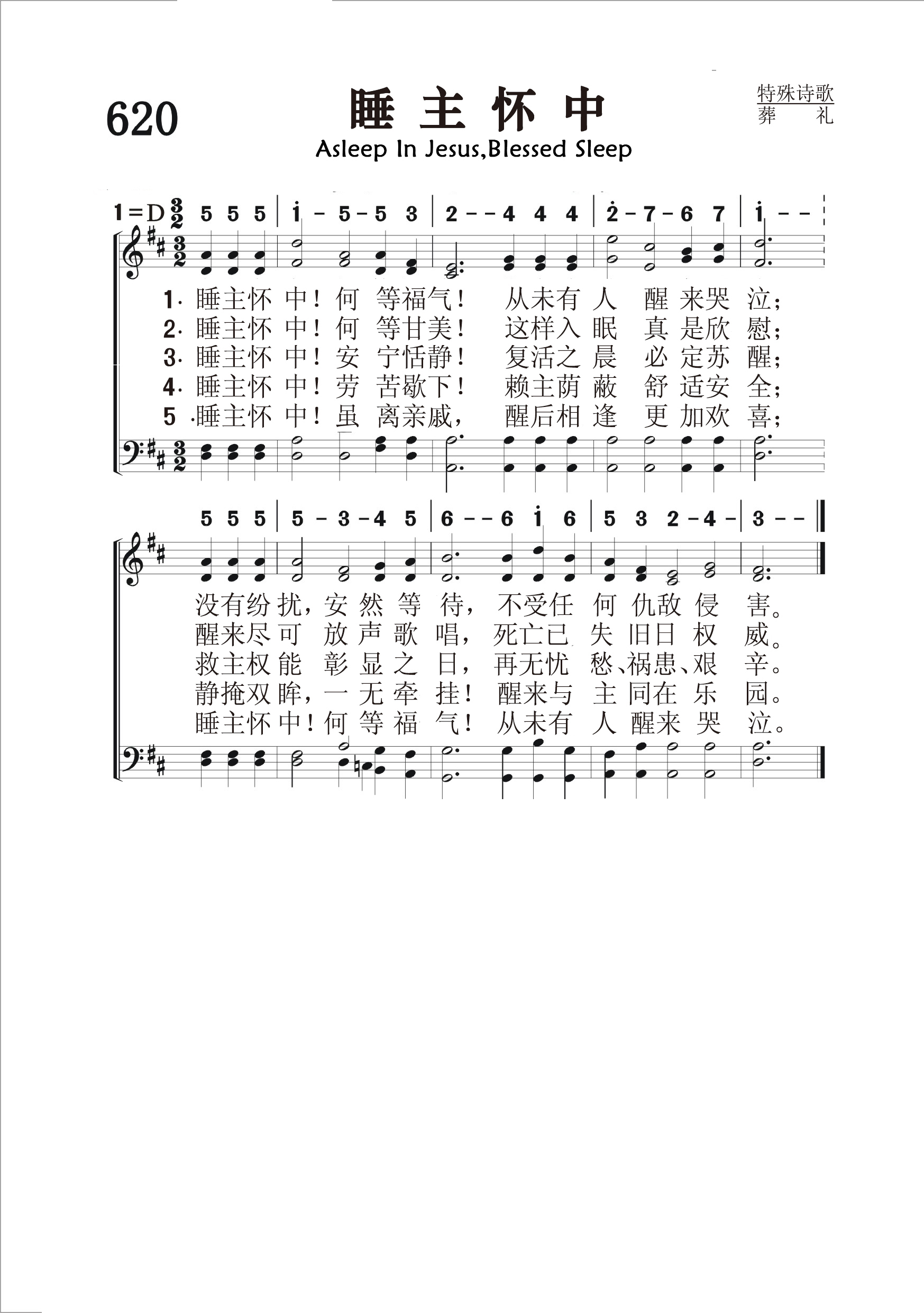 第620首 睡主怀中Asleep in Jesus,Blessed Sleep 玛格丽特.麦凯(Margaret.Mackay,1802-1887,1,5)作词(1832年),布雷德伯里(W.B.Bradbury,1816,10,6-1868,1,8)作曲(1843年) 睡主怀中!何等福气!从未有人醒来哭泣; 没有纷扰,安然等待,不受任何仇敌侵害。 睡主怀中!何等甘美!这样入眠真是欣慰; 醒来尽可放声歌唱,死亡已失旧日权威。 睡主怀中!安宁恬静!复活之晨必定苏醒; 救主权能彰显 之日,再无忧愁\祸患、艰辛。 睡主怀中!劳苦歇下!赖主荫蔽舒适安全; 静掩双眸,一无 牵挂!醒来与主 同在乐园。 L睡主怀中!虽离亲戚,醒后相逢更加欢喜; 睡主怀中!何等福气! 从未有人醒来哭泣。 “但基督已经从死里复活,成为睡了之人初熟的果子。”(林前15:20) 本诗的词作者是英国长老会女信徒玛格丽特.麦凯。她出生于英国苏格兰的一个军人家庭。1820年,她与一著名军官威廉.麦凯结婚。有一次玛格丽特.麦凯同一位朋友驾车到德津郡野外去旅游,路过郊区一座教堂,便进去参观,教会后面有墓园,这在英美国家比较常见。该教堂刚建成不久,墓园还未修成花园的样子,可是打扫得却很干净。麦凯夫人信步走到一个墓前,墓碑上刻着“在主里睡了的人”几个大字。基督徒对死亡的观念,和如此幽静的环境,使麦凯夫人写下了《安眠主内》这首诗。 曲谱调名叫《安息(Rest)》,是布雷德伯里所写。其旋律和声构成无比宁静的气氛,在丧礼中给人莫大的安慰。 布雷德伯里出生于美国缅因州约克。他14岁以前没有接触过风琴,钢琴。1830年随家迁往波士顿,才接触这些乐器。他参加了梅森的唱诗培训班,后来与梅森在师范研究所共事。他在工作中表现了杰出的音乐天才,曾任浸信会数个会堂的管风琴师和唱诗班指挥,待遇菲薄,年薪仅25美元,但他却毫不计较。他后来到纽约教儿童唱歌,并向中学生介绍音乐,讲解乐理。1847年他获得机会去德国深造,跟名师学习,返美后专任音乐教师。他在1841-1867的二十六年时间里,平均每年出两本赞美诗集,总计59本,包括《金链》,《鲜月桂》等,销量达二百万册以上。 1854年,他自己成立钢琴制造厂。1917年该厂并入纳普音乐工厂。他所编写的许多音乐书籍和圣诗曲调,已在世界各地广泛流传。