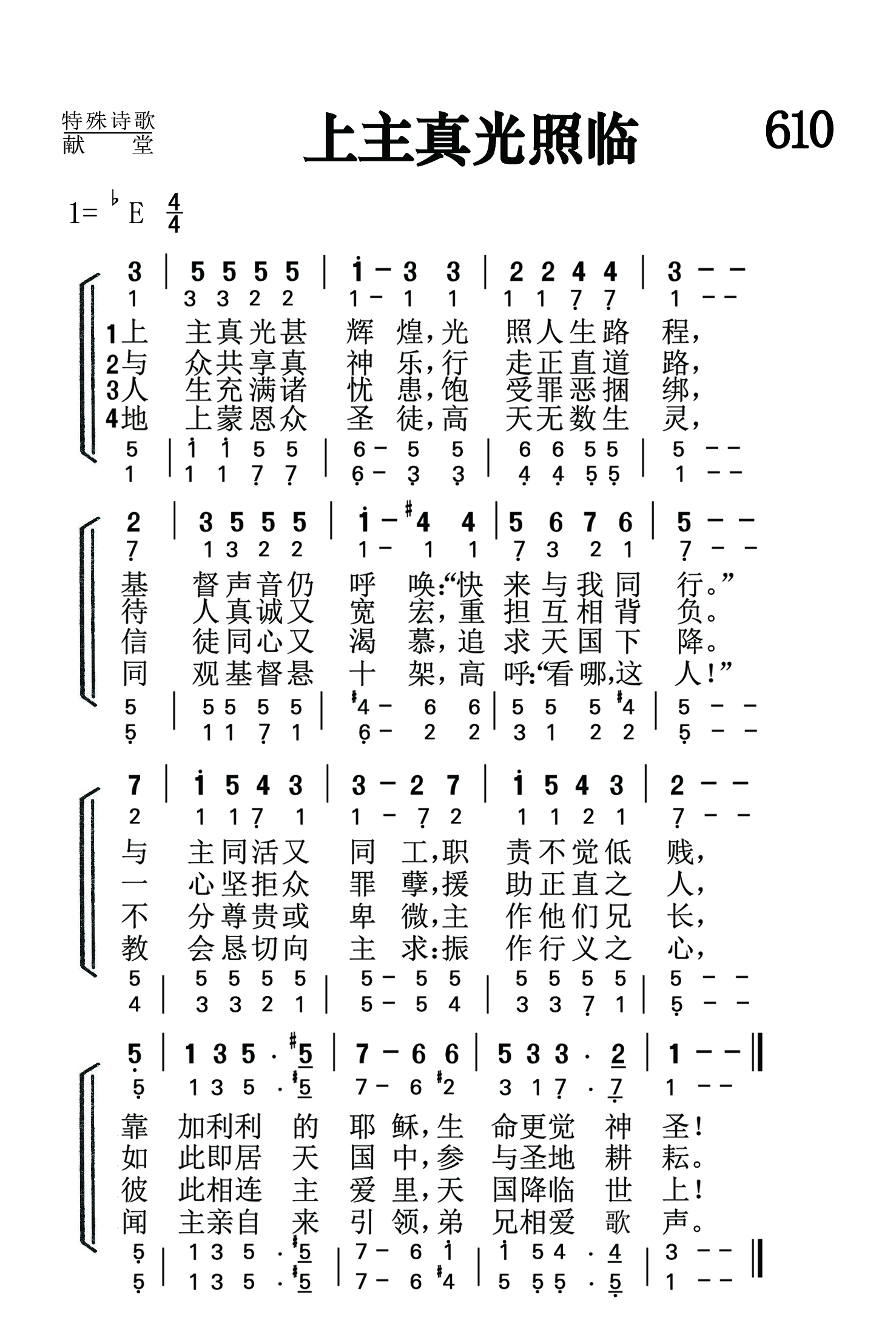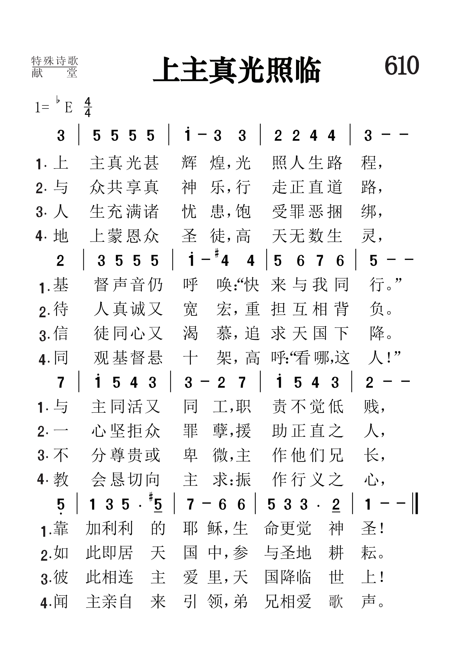 第610首 上主真光照临The Light of God Is Falling 路易斯.本森(Louis F.Benson,1855.7.22-1930.10.10)作词(1910年);根据迈克尔.海顿(M.Haydn,1737,9,14-1806,8,10,见21首介绍)原曲编配(1819年) 上主真光甚辉煌,光照人生路程。基督声音仍呼唤:“快来与我同行”。 与主同活有同工,职责不觉低微,靠加利利的耶稣,生命更觉神圣! 与众共享真神乐,行走正直道路。待人真诚又宽宏,重担互相背负。 一心坚拒众罪孽,援助正直之人。如此即居天国中,参与圣地耕耘。 人生充满诸忧患,饱受罪恶捆绑,信徒同心又渴慕,诛求天国下降。 不分尊贵或卑微,主作他们兄长,彼此相连主爱里,天国降临世上! 地上蒙恩众圣徒,高天无数生灵,同观基督悬十架,高呼:“看哪,这人!” 教会恳切向主求:振作行义之心,闻主亲自来引领,弟兄相爱歌声。 路易斯.本森出生于美国费城,毕业于费城法律大学,但只从事法律工作7 年。1877年,他进入他父亲担任受托人的普林斯顿神学院,毕业以后,被按立为牧师,在宾夕法尼亚州的长老会服务。他是圣诗学权威,有藏书九千余册。1895年,他帮助编辑美国长老会赞美诗集。在圣诗方面著述颇多。 迈克尔.海顿是奥地利音乐大师海顿(清唱剧《创世记》等的作者)的弟弟。他既是男高音歌唱家,同时又精通多种乐器。和他的哥哥一样,他是一位无师自通的天才音乐家,曾创作圣歌近460首,长期担任教会司琴和圣乐队指挥。21首《敬拜大君王》,《赞美诗》(505版)101首《宝贵救主》也是他作曲的。