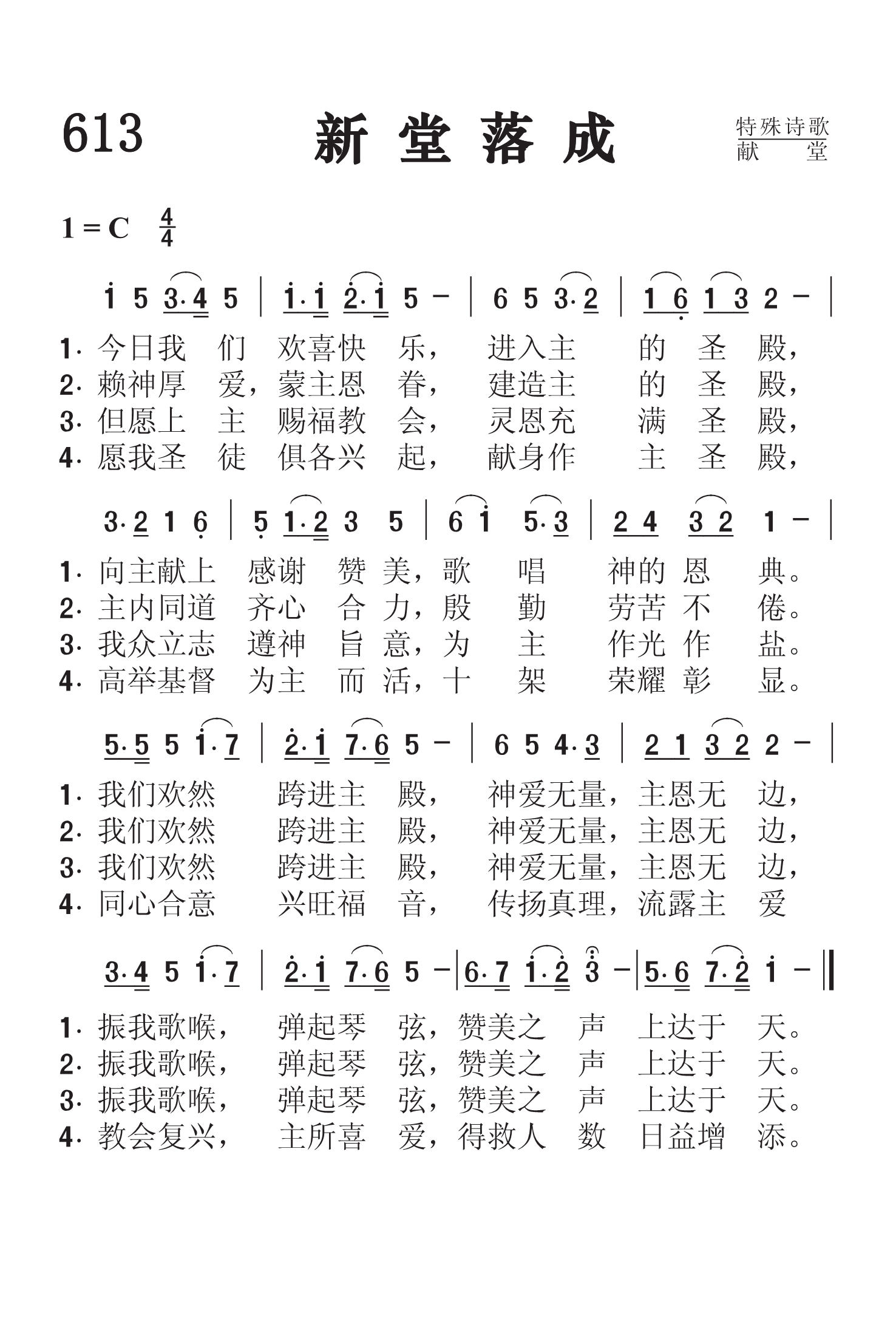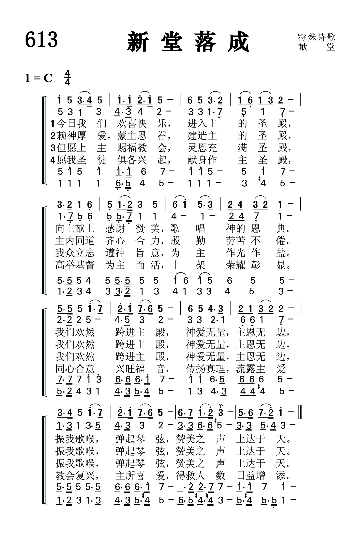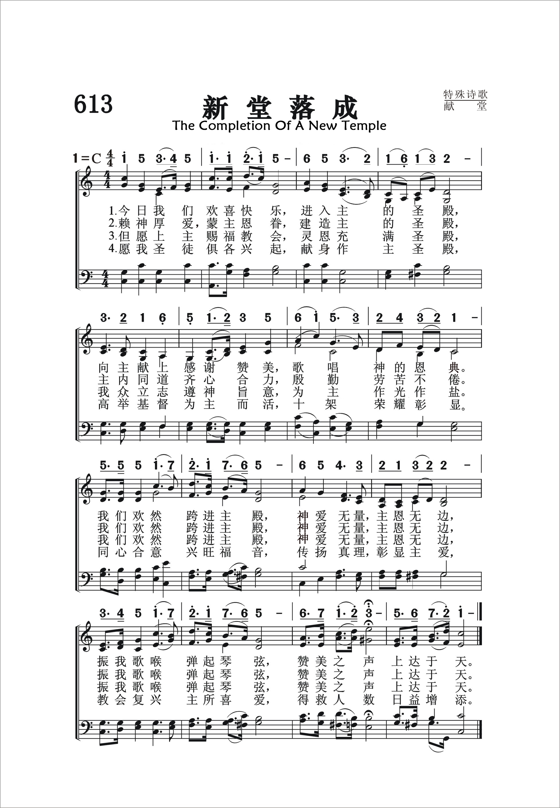 第613首 新堂落成 The Completion of a New Temple (《颂赞圣诗》第524首) 今日我们欢喜快乐, 进入主的圣殿, 向主献上感谢赞美,歌唱神的恩典。 我们欢然跨进主殿,神爱无量,主恩无边, 振我歌喉,弹起琴弦,赞美之声上达于天。 赖神厚爱,蒙主恩眷,建造主的圣 殿, 主内同道齐心合力,殷勤劳苦不倦。 我们欢然 跨进主殿,神爱无量,主恩无边, 振我歌喉,弹起琴弦,赞美之声,上达于天。 但愿上主赐福教会,灵恩充满圣殿, 我众立志遵神旨意,为主作光作盐。 我们欢然跨进主殿,神爱无量,主恩无边, 振我歌喉,弹起琴弦,赞美之声上达于天。 愿我圣徒俱各兴起,献身作主圣殿, 高举基督为主而活,十架荣耀彰显。 同心合意兴旺福音,传扬真理,流露主爱 教会复兴,主所喜爱,得救人数日益增添 这是一首庆贺新堂落成的诗歌。当我们欢聚在新建的圣殿时,我们首先所要想到的是上帝的浩大恩典。是祂的大爱激励了我们,感动信徒们齐心协力完成了建造的大工程。从今以后,弟兄姐妹要在圣灵的引导下,团结一致兴旺主的福音,使得救的人数天天加增,荣耀归主名。