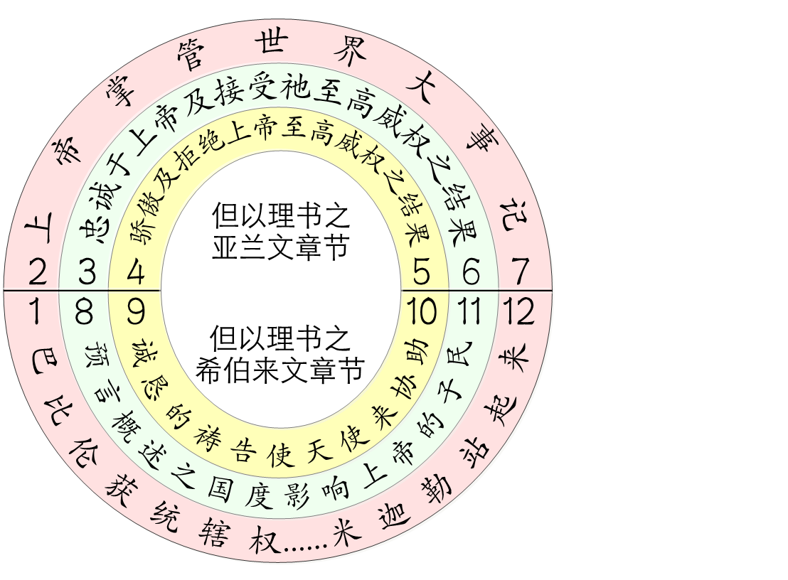 但以理的文采非常好,他写这本书的时候,采用的是一种环环相扣的结构:第一章对应第二章;第三章对应第八章;第四章对应第九章;第五章对应第十章;第六章对应第十一章;第七章对应第十二章,每一章都有相对应的内容。从上图看来,他把世界要发生的事件,在文笔结构上进行了一个很有趣的展示,亚兰文的章节和希伯来文的章节是分开处理的。我们从文学角度上来看,能看到它的主调。但事实上从更多的情况来看,相比较一下,这卷书和《创世记》是有些联系的。