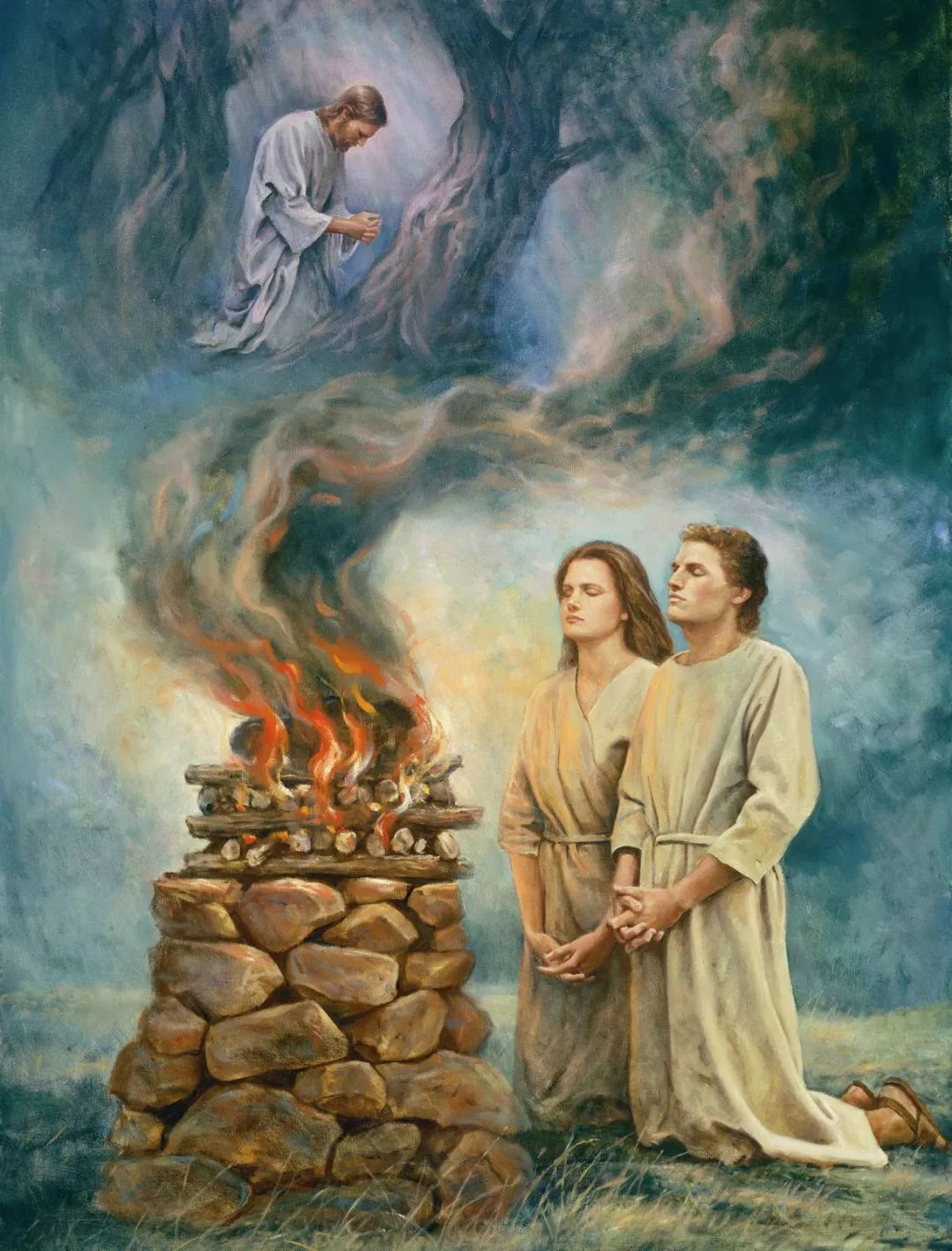 接着圣书记载了亚当和夏娃很快有了自己的孩子——该隐和亚伯。而且这两位也都懂得要到伊甸园门外来献祭。亚伯带着自己羊群中头生的和羊的脂油献上,而该隐却拿着地里的出产来献给耶和华。亚伯的祭带着血带着生命,是一个赎罪祭;而该隐所献的祭没有鲜血,只是一个感恩祭,没有生命,没有赎罪。他是把自己的劳动成果直接拿来献祭,在上帝面前表明自己的行为所带来的果实,没有羔羊牺牲所带来的认罪悔改的行为。所以,该隐所献的祭没有被上帝所接纳。我们从这件事情上可以知道,上帝当时给了亚当一个完整的献祭制度,不然他的这两个孩子就不会知道该怎样献祭才符合上帝规定的程序。虽然圣书没有用详细的文字记载整个献祭的体系,但是通过该隐和亚伯的献祭活动,我们就可以知道的确有一套完整的仪文律法与献祭制度启示给了亚当,并且由亚当传给他的后裔。