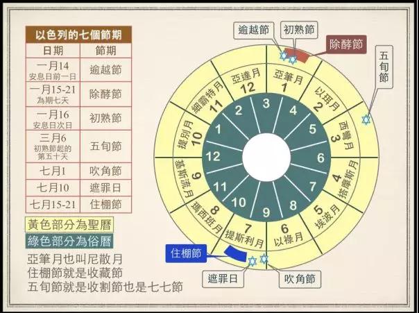 而且我们还注意到,这七个节期在一年十二个月中前后共排了七个月。《创世记》中有一个一周七天,第七日是安息日,上帝与始祖同在;而以色列的节期是七个月,到第七个月即住棚节的时候,所有的节日就结束,实现“上帝与我们同在”这样的终极目标。《启示录》的七个教会和七个节期中的七个月有一一对应的关系,而且《启示录》中有很多七,如七信,七印、七号、七灾等等。所以,以七为循环的这种思想是非常典型的圣书思想。