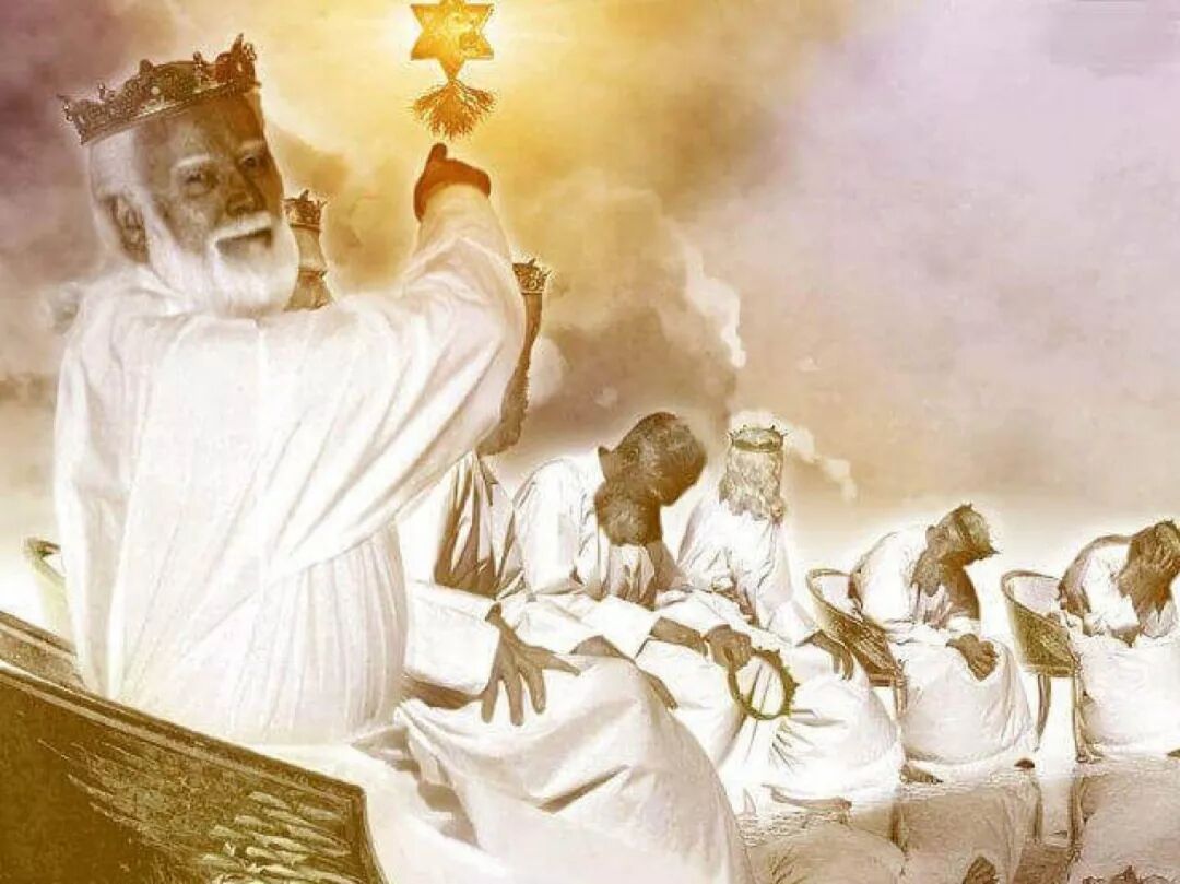 《启示录》的第四章和第五章,它是一个完整的画面。在这样一个场面之下,看到了在第四章描述了天上的情形;天上有宝座的房间——这是指天上的至圣所。宝座上坐着的是天父上帝,在祂前面有24位长老,24位长老也坐在自己的位上。之前已经给大家反复地谈过,24位长老就是大能的天使,是天上有位的、且位置最高的长老。因为他们有一个职能,就是要拿着香炉。金香炉就是代表圣徒的祷告,他们要来处理我们人间的祷告,把我们的祷告带到上帝的宝座面前。在宝座前还有四活物以及七灵,他们唱赞歌来赞美上帝,因为上帝是配得荣耀、尊贵、权柄,祂创造了万物。