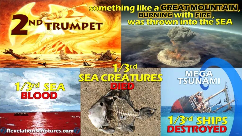 第二号提到“烧着的大山扔在海里”,此外还提到海里面的海水、海中的活物、船只,这些都是在海里面进行的。我们可以看到第二号主要描写的是海上的战争。那么什么叫做“仿佛火烧着的大山”呢?我们可以回顾耶51:25:“耶和华说:‘你这行毁灭的山哪,就是毁灭天下的山,我与你反对。我必向你伸手,将你从山岩滚下去,使你成为烧毁的山。’”从这段经文就可以看到,上帝用大山来形容巴比伦、迦勒底。可以说在第二号里面,这个“山”应该是象征着罗马,它被扔在海中,传统上把这一次的时间通常放在公元428年到476年,罗马和盖塞里克之间的交锋主要是海上。罗马有两支大的舰队;一支在罗马,另外一支在君士坦丁堡。在君士坦丁堡的这支舰队上,他的将士有十万之众。根据《罗马帝国衰亡史》第36章的记载,说盖塞里克他从海上来进攻,在迦太基这个地方,一夜之间半数以上的罗马战船和上面的士兵,就有1113艘船,十万大军在烈火与刀剑的猛攻之下惨遭覆没。