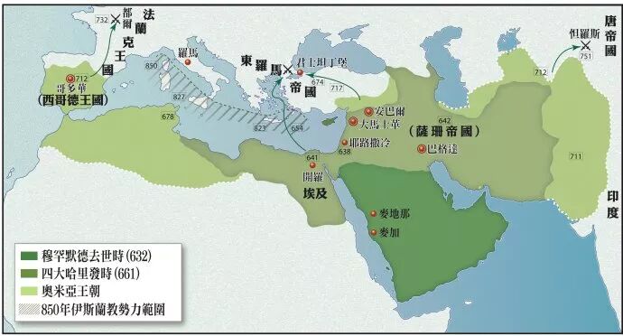 在此所说的阿拉伯帝国,居鲁士从632年开始,从哈利发国开始,伊斯兰教在半岛建立统治——伊斯兰教的统治。唐朝以来的中国史书,就把这个阿拉伯帝国称之为“大食”,即大小的“大”,食物的“食”;而在西方,把它们称之为“萨拉森帝国”,也就是东方人的帝国。这个帝国前后存在了600多年。有正统哈利发时期,武缦耶王朝,以及阿伯斯王朝。在第五号中间,就会出现且会提到阿伯斯王朝。这个帝国最强盛的时候,它的疆域,从印度河到中国的边境,到西方的大西洋的沿岸,北到里海,南接阿拉伯海。之前提到它是在波斯帝国、希腊帝国、罗马帝国之后的又一个跨亚、欧、非三大洲的大帝国。第五号就与这个帝国有关。