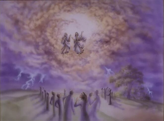 启11:12“两位先知听见有大声音从天上来,对他们说:'上到这里来。'他们就驾着云上了天,他们的仇敌也看见了。”这一段话的说法和启4章说法非常的相似,启4:1天使也是对约翰说:“你上到这里来。”我们看到1793年《圣书》被禁止以后,有生气再次赐给这两个见证人,这两位先知听见有声音对他们说:上到这里来。