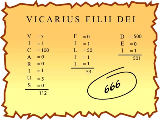 我们刚才谈到了罗马天主教,它长期使用的一个名号,就是“上帝儿子的代理人”,希腊字母写成“VICARIUS FILII DEI”,这有明显的亵渎的性质。我们可以从看一个列表,把这些个数字(字母的数目)加在一起,正好就是六百六十六。